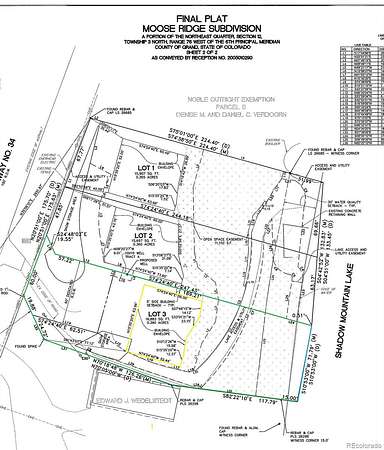 Est $5,853/moHome site at Moose Ridge on Shadow Mountain Lake! The .39 of an acre which is for sale can be seen on the left side of the photo below, with the building footprint up near where the large gray boulders are. This picture was taken from the lake a few years ago, and it shows the path down which you can walk or transport a kayak or a standup paddleboard. You own the 71 feet along that left side portion of the shoreline shown in the photo. R308866 Moose Ridge: Lot 3 #13212 Highway 34. $725,000.