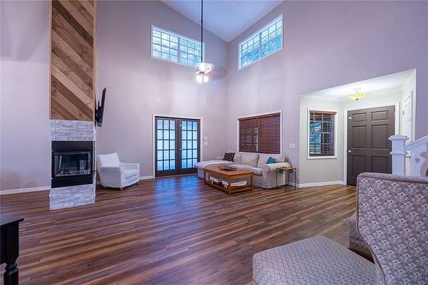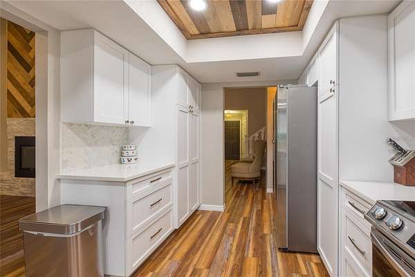 Following the tree-lined driveway brings you to the main home, a beautifully updated three-bedroom, two-bath residence with soaring ceilings, custom woodwork, and a striking fireplace feature. This home has been fully renovated with SMARTCORE LVP flooring, modern paint, and newer fixtures. The kitchen and baths showcase plenty of wood cabinetry with soft-close hardware, quartz countertops, stainless steel appliances, and a stylish herringbone backsplash. A partial wrap-around porch with an enclosed hot tub creates the perfect place to unwind, while the open porch at the entrance offers peaceful views of the pond.