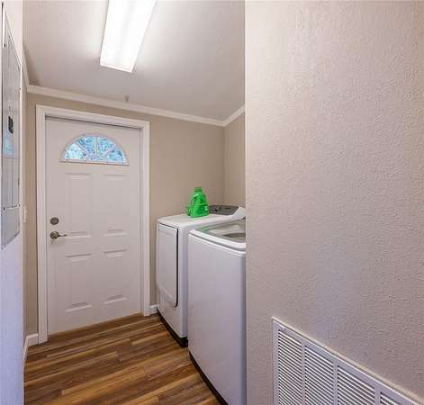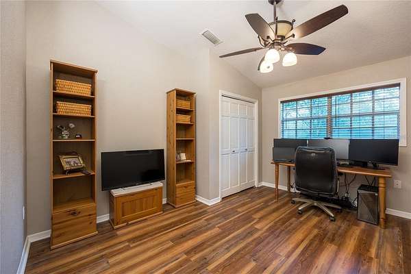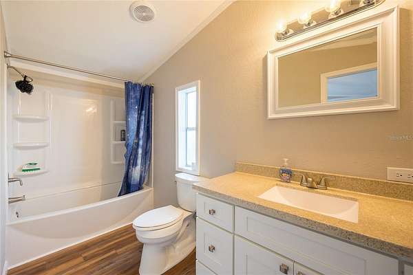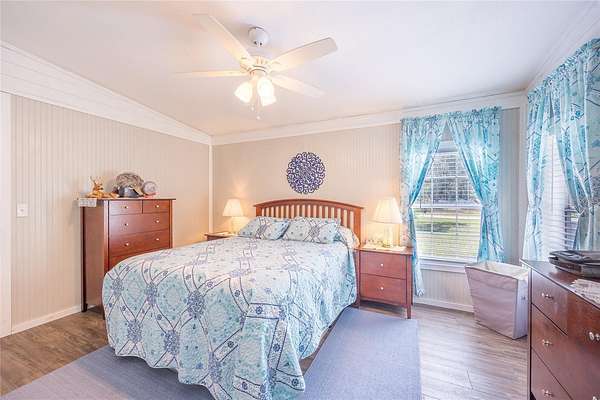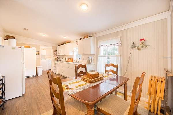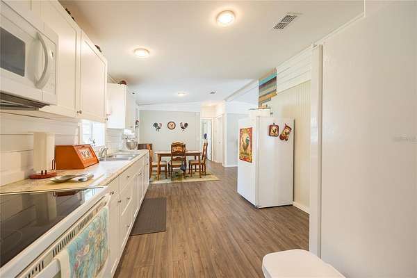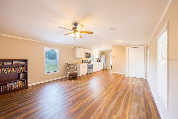 Just across the driveway sits the third dwelling, a remodeled two-bedroom, two-bath mobile home which is currently occupied by a tenant until 11/1/2026. With LVP flooring, fully updated kitchen and bathrooms, and custom woodwork, this home is move-in ready and ideal for extended family or rental potential.