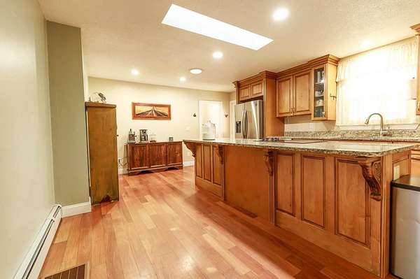 Experience the perfect blend of rural tranquility and commuter convenience in this sprawling Dublin ranch. Set on 4.31 private acres within the Contoocook Valley School District, this property offers a rare "one-level living" floor plan that is equally suited for those looking to downsize or a growing family in search of space and flexibility. Situated on Route 101, far back from the road, the location provides a direct, easy commute east to Manchester and Nashua, or west to Keene and Vermont. The home's exterior has been recently transformed with beautiful, natural vertical board siding and a roof that is only three years old and carries a transferable warranty. Inside, the home is bathed in natural light, showcasing wood flooring that runs throughout. The kitchen is designed for the home chef, featuring stylish wood cabinetry, newer stainless steel appliances, and a functional island. The adjacent dining room, centered around a classic fireplace, flows into a versatile office, den, or workout room. The colors are warm and engaging and the sunlight will be sure to brighten every family gathering. The primary suite features a private ensuite bath and walk-in closet, while a second large bedroom includes a dedicated sitting area--perfect for a home office, nursery, or reading nook. A third bedroom and additional full bath ensure plenty of room for guests. For additional living space, the sunroom has been updated with new sliders, fresh flooring, and natural beadboard. The walk-out basement is a standout feature, protected by a warrantied waterproofing system and equipped with a newer wood stove, providing a powerful and efficient secondary heat source. Outside, the level 4+ acre lot offers New Hampshire hobby farm possibilities, ready for goats, chickens, or expansive gardens, all while enjoying views of Mount Monadnock. Parking and storage are ample with a two-car garage and an additional carport.