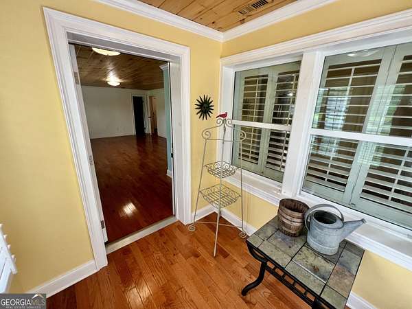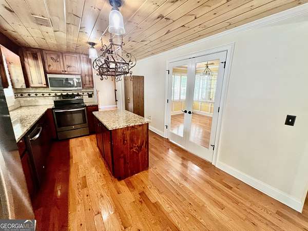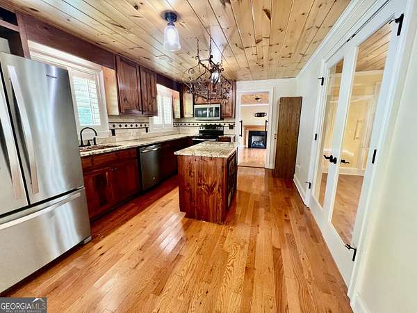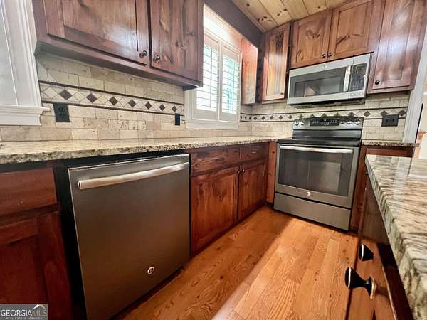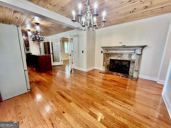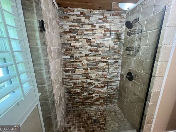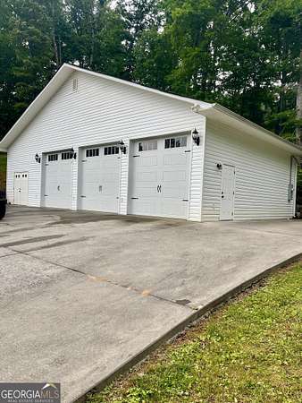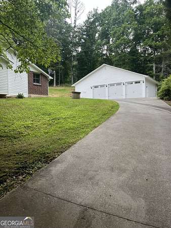 Timeless traditional brick meets modern convenience in this beautifully updated North Georgia mountain retreat. Originally built in the 1950s, this spacious 3-bedroom, 2-bath home has been thoughtfully renovated for today's lifestyle. Subtle color palettes flow throughout, complemented by natural light filtering through plantation shuttered windows. The kitchen boasts granite countertops, custom cabinetry, and a seamless transition to the separate dining room and cozy fireplace-ideal for family gatherings. A large living room with its own fireplace features wall-to-wall windows that capture stunning country vistas. The grand master suite is a true retreat, complete with a luxurious tile bathroom and heated floors. Step outside to your dream workspace: a detached 3-bay garage, fully equipped with HVAC, a bathroom featuring a tankless water heater, and a built-in compressed air line for pneumatic tools. The garage features extra-tall ceilings for accommodating larger projects, a smart MyQ garage door opener, and convenient pull-down attic stairs for added storage. Whether you're a car enthusiast, craftsman, or simply need extra space, this garage delivers unmatched versatility.