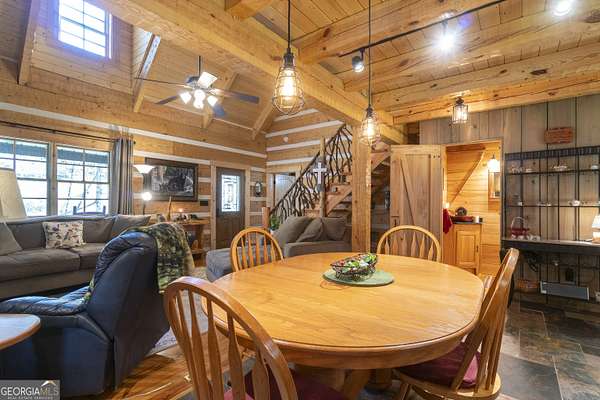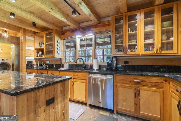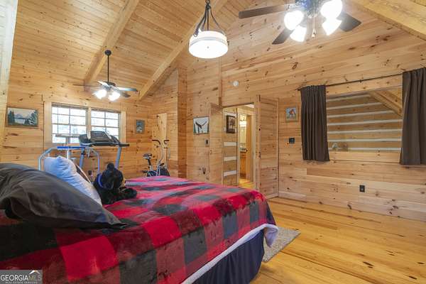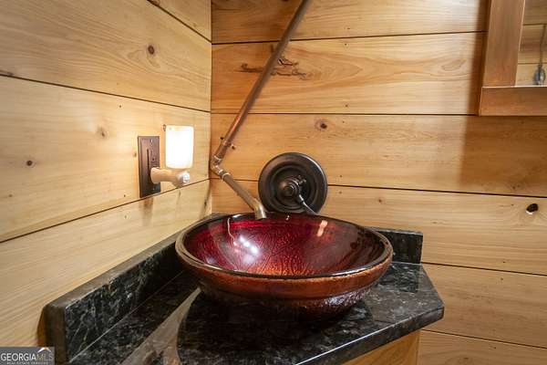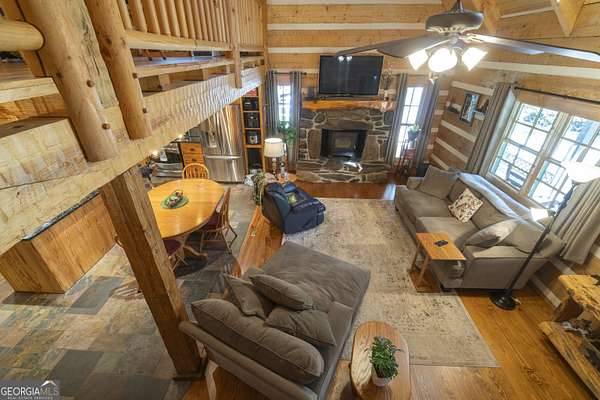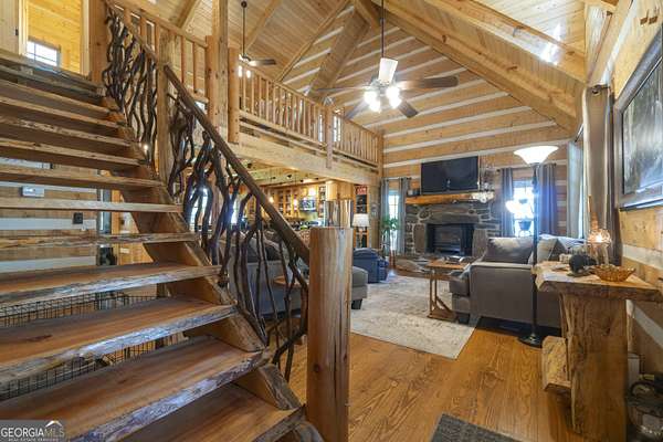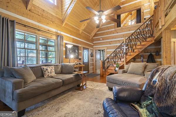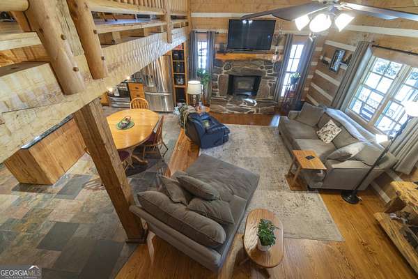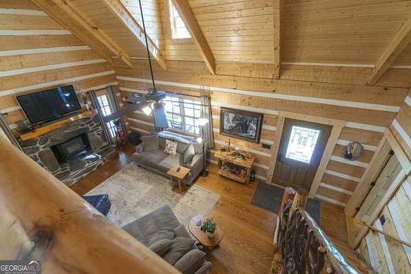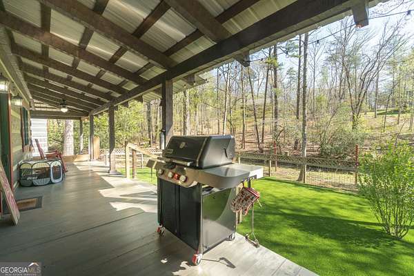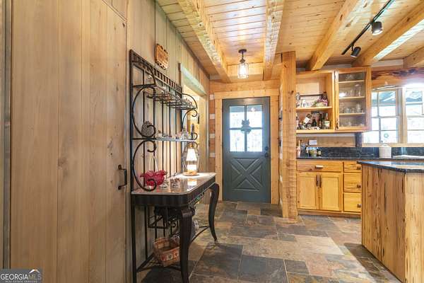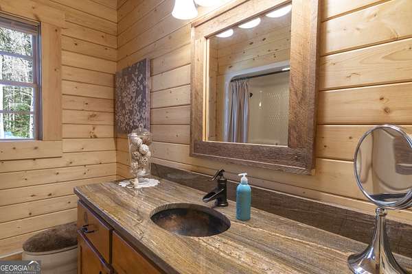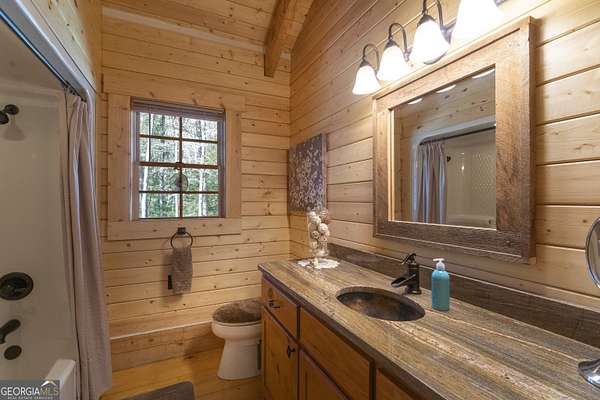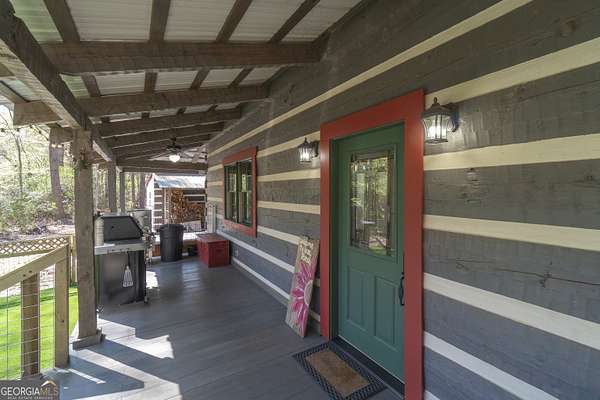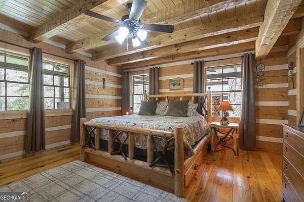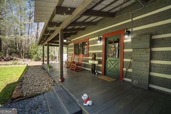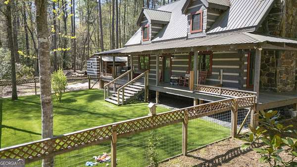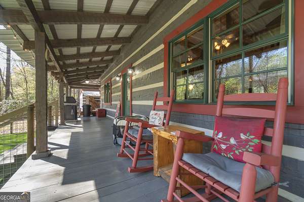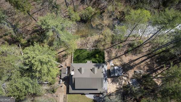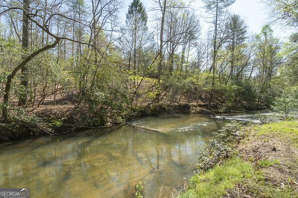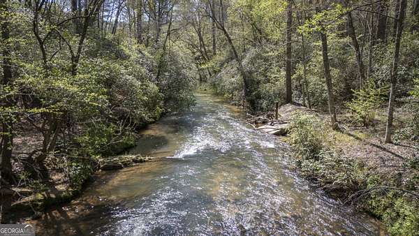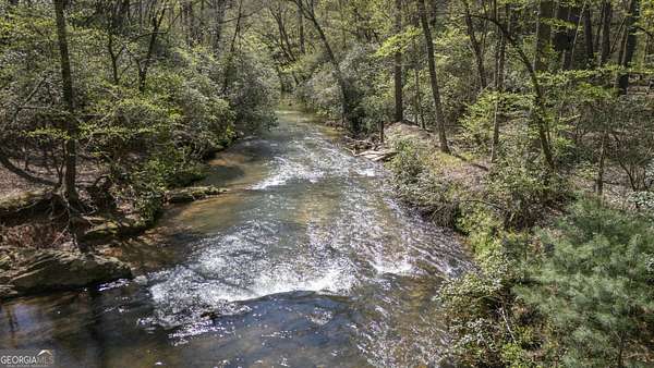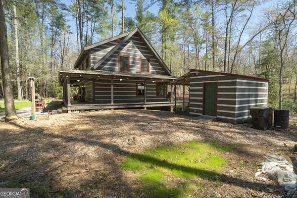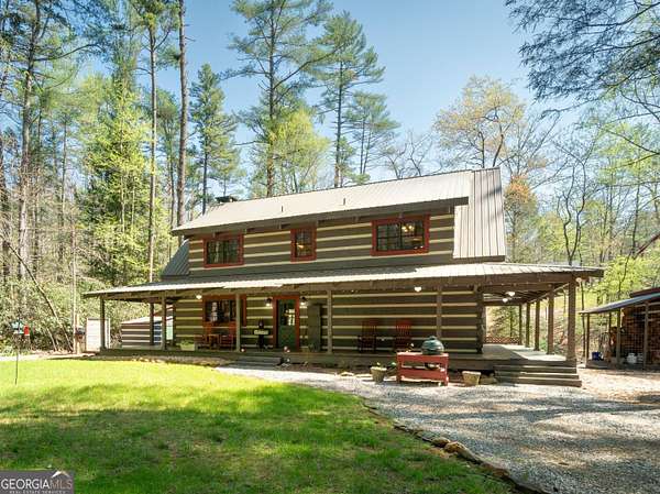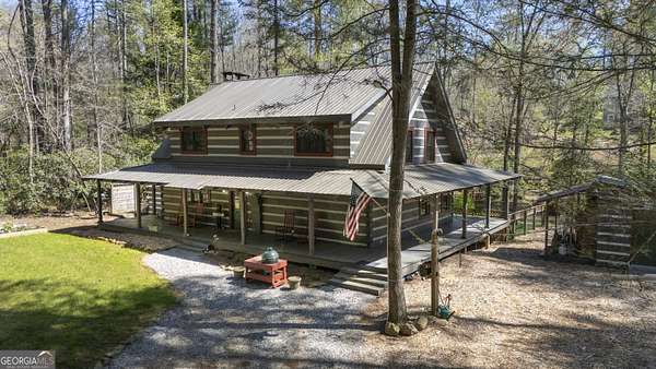 369 feet of frontage on rushing Town Creek is host to this exquisite real Cypress Log Cabin with chinking and dove tail construction. Add to that a full wrap around porch, fenced back yard and a massive masonry river stone fireplace on a very private 1.91 wooded acres with private driveway and private well. The two-story chimney, mostly admired from outside the home, is a thing of beauty. The stones are so large you will be in awe. In the oversized firebox, a Buck stove has been installed along with a stainless-steel chimney liner for super-efficient heating, if you prefer to heat with wood. Other Luxury interior features include, heart pine flooring, standing seamless glass shower in primary bath with Granite Slab walls & exotic striated granite slabs on the bathroom counters, accented with hammered copper sink basins. Tile slate floor and a copper sink in the kitchen adds to the elegance. Need more? The kitchen cabinets are made of uniquely distinctive Pecky Cypress lumber, many with glass fronts, adding to the charm of this custom home. The Kitchen also features Labradorite Blue Granite, "nearly new" stainless appliances including an over the stove state of the art 3 function microwave (air fry, microwave & convection oven) with fan exhausting to the exterior of the home. All in all, this home is an exceptional blend of log home style with open beam construction and elegant interior finishing. If you are looking for a quiet place to live while maintaining a high standard of living, this is it. Outbuildings are a plus along with a poured concrete foundation and crawl space. Don't miss this opportunity to buy a home that is very special and priced to sell! Contributing toward Road maintenance fund is voluntary but recommended. The year built on tax card is 2008, when permit was pulled, but C/O was issued in 2018. This was a custom build by the original owner/builder who built it himself. Low/No maintenance water conditioner with self-contained softening media is installed for softer water.