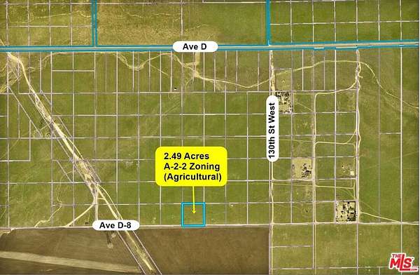 Fantastic opportunity to own 2.49 acres of flat, rural land in the growing Lancaster area of Antelope Acres, located near Poppy Reserve. This versatile parcel is zoned A-2-2 (Heavy Agriculture) in Los Angeles County, allowing for a wide range of uses. Whether you're planning to build a custom home, establish an agricultural operation, or hold as a long-term investment, this property offers flexibility to suit your vision. The land features beautiful desert and mountain views, peaceful surroundings, and convenient proximity to paved Highway 138 (Ave D). Ideal for off-grid living, recreation, farming, ranching, or potential future development, the zoning permits single-family residences, greenhouses, nurseries, wineries, animal shelters, apiaries, dog kennels, and the raising, breeding, and training of horses and livestock including cattle, sheep, and goats. Riding academies, stables, and horse boarding are also allowed, making this an exceptional opportunity for agricultural, equestrian, or rural residential use. Don't miss your chance to secure a slice of California's landscape. Directions: From Highway 14, exit at Highway 138 (Ave D) and proceed west. Turn left onto 130th St West. Continue approximately 0.5 mile, then turn right. The property will be on the right side.
