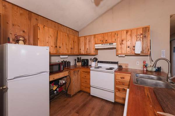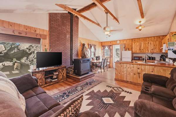 Inside, you'll find a warm and inviting open-concept floor plan featuring vaulted ceilings, exposed wood beams, and a cozy wood-burning stove, creating the ideal cabin-style living experience. The kitchen flows seamlessly into the living and dining areas, perfect for entertaining or a peaceful getaway.