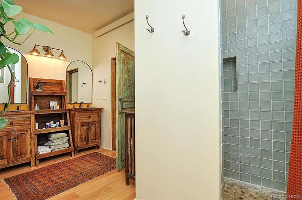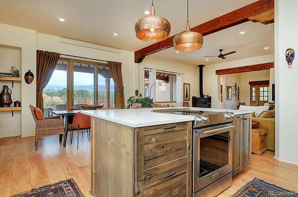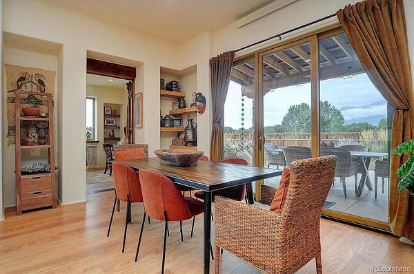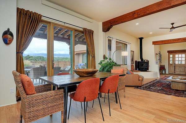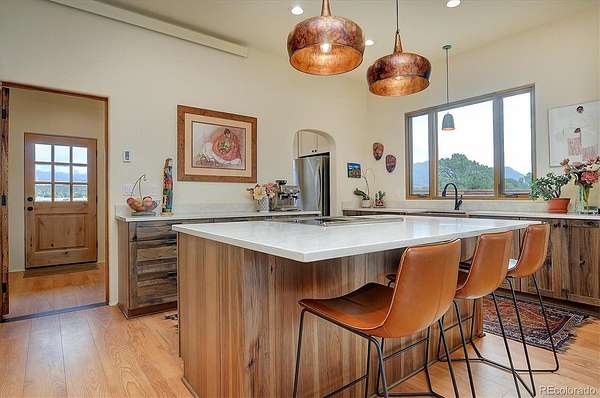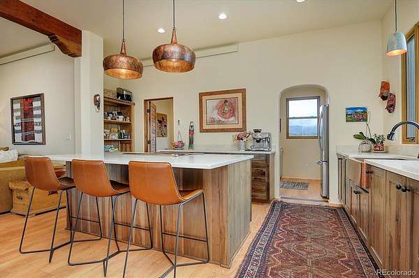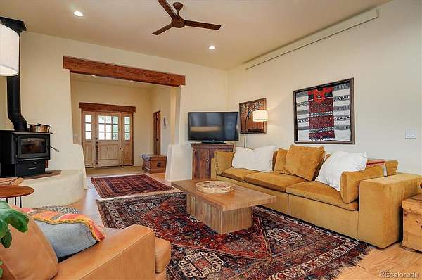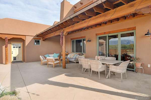 Experience elevated living in timeless Santa Fe style. Nestled in the heart of a storied mountain town rich with heritage and natural beauty, this custom-built residence is the pinnacle of elegance. Thoughtfully designed in the classic Santa Fe style, this home blends handcrafted detail with modern sophistication - all set against a backdrop of sweeping mountain vistas. From the moment you step inside, you're welcomed into a space where organic textures, warm hues, and clean contemporary lines coexist in harmony. Exposed vigas, intentionally curated doors and eclectic features reflect timeless character, while upscale appliances, energy efficient heating units and expansive glass windows bring comfort and innovation to every room. The open-concept great room flows effortlessly into a chef's kitchen and dining space - ideal for entertaining or quiet evenings by the free-standing wood burning stove. Two generously sized suites, spa-inspired bathrooms and private outdoor courtyard offer moments of serenity, while the stunning rooftop deck offers panoramic views that frame sunrises and sunsets over the mountains. Two versatile outbuildings, a large yurt and studio provide additional creative or office space. Augmented well allows for outside watering. Private trail system for Yale Lake residents only. Located minutes from historic downtown restaurants and shops, hiking trails, with the Arkansas River and ski slopes nearby, this is more than a home - it's a lifestyle immersed in nature and refined mountain living. See uploaded Architect Elevations, Site Plan and Special Features document for additional details.
