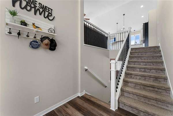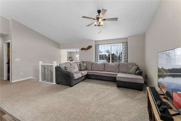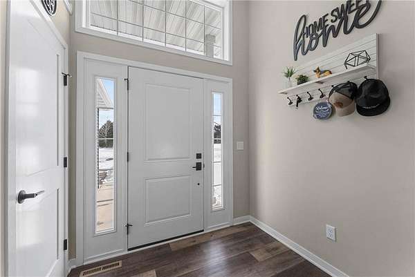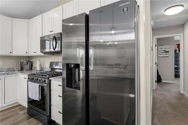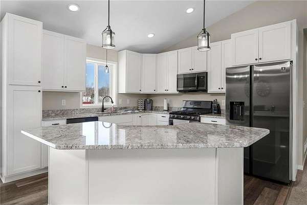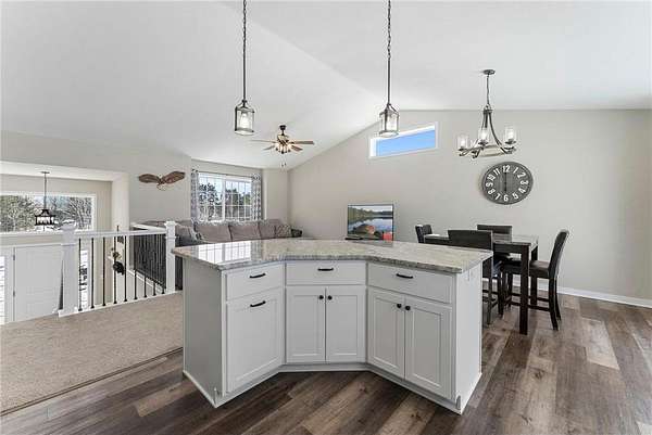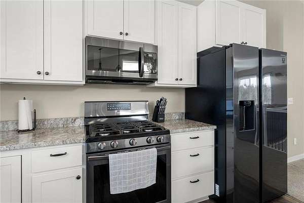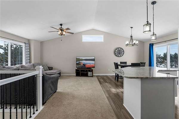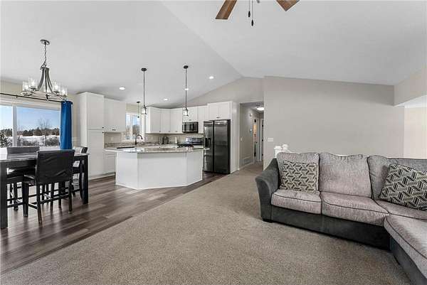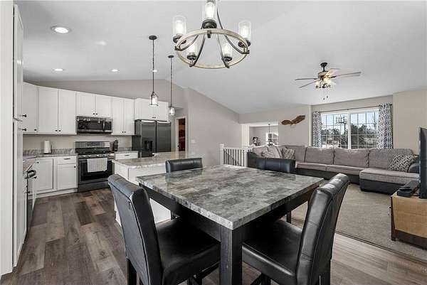 The bright and open main level features a spacious living area, white enameled cabinetry with soft-close doors and drawers, and a stunning kitchen and dining area with durable luxury vinyl plank flooring. The kitchen is designed for both everyday living and entertaining, complete with stainless steel appliances, granite countertops, and a center island that provides extra workspace and seating. The layout is perfect for daily life while still offering a warm and inviting space to gather with family and friends.
