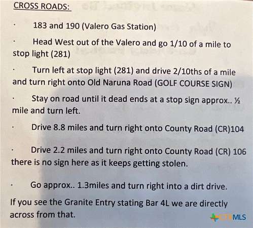 In Lampasas, at corner of 183 & 190 (Valero Gas Station), head West, go 1/10 of a mile to stop light at 281 take a Left & drive 2/10 of a mile then turn Right on Old Naruna Rd. at stop sign turn Left. Drive 8.8 miles then turn Right onto CR 104. Go 2.2 miles & turn Right on CR 106. Go approx 1.3 miles & turn Right into a dirt drive. If you see the entry stating Bar 4L, property is across from it.