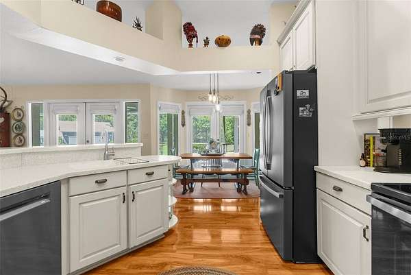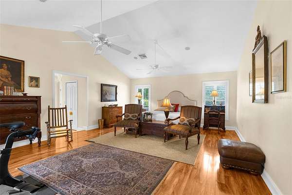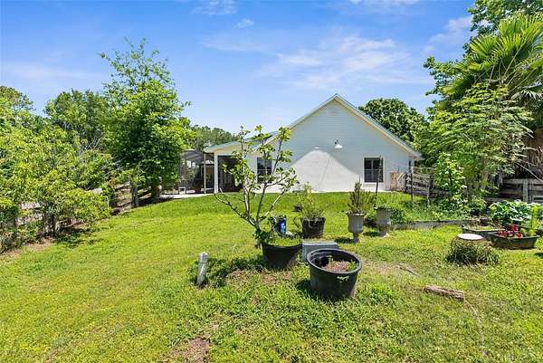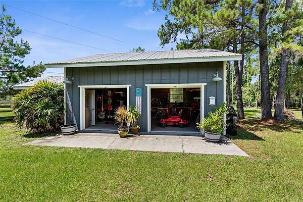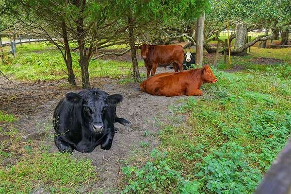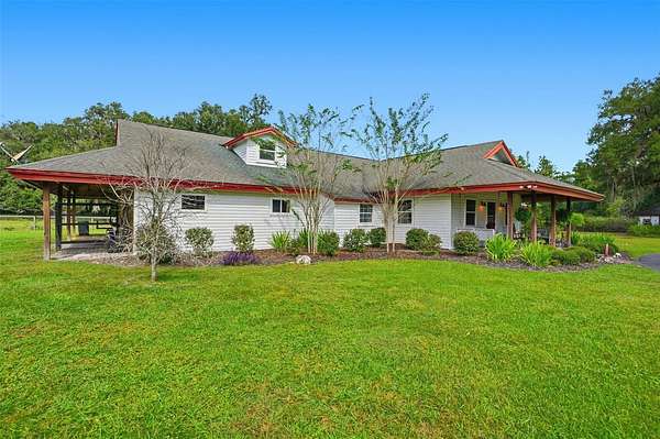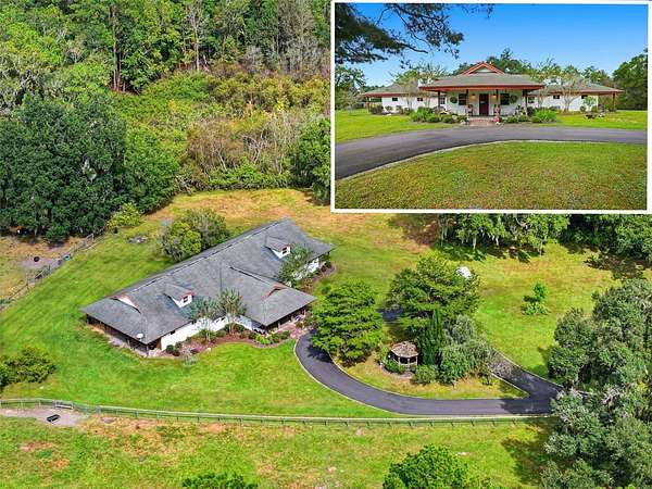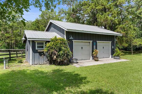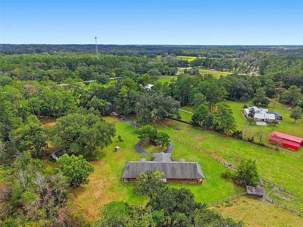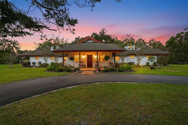 MAIN HOME: This STUNNING COUNTRY HOME is nestled in the trees with a winding creek along the back property line...and looks like something straight out of the pages of Southern Living Magazine!! This home offers 3 large bedrooms + 2 full bathrooms + 3-car oversized attached garage + beautiful board-fencing and improved pastures with grand mature oak trees that simply take your breath away!! Build a tree-house in the canopy of trees!! The home is meticulously maintained, in mint condition, and move-in ready!! You'll fall in love with the inviting front porch, complete with classic brick pavers and stacked stone columns -- it's a picture-perfect setting for a porch swing and rocking chairs to enjoy time with your family, cool breezes, a little sweet tea, and beautiful pasture views! Step inside and discover a home that radiates warmth and comfort. With its open floor plan, high ceilings, large glass windows and glass French doors, this home feels light, bright, and spacious. It's design seamlessly blends the indoors with the feeling of being outdoors and feels incredibly private as you don't see any neighbors! The master suite, with double door entry, is impressively large with enough room to have your bedroom and a small living room together in your suite! The master ensuite bathroom has dual sinks, soaking tub, separate walk-in shower, private toilet room, and large walk-in closets! The second bedroom is over-sized, as well, with an ensuite bathroom...offering you a second master bedroom set-up. The third bedroom is currently set up as a large office. The home offers a covered lanai and extended screened lanai--the perfect space for year-round entertaining family and friends or relaxing with views of nature all around. The home is complete with a newer life-time metal roof, and the private iron-gated entrance with stone pillars welcomes you with elegance and presence, leading down a long concrete driveway with additional parking for gatherings big or small. ZONED AG. NO HOA. NEWER ROOF (MAY 2018). NEWER AC (OCT 2021). NEW APPLIANCES 2024. HOUSE and BARN are HIGH AND DRY!!