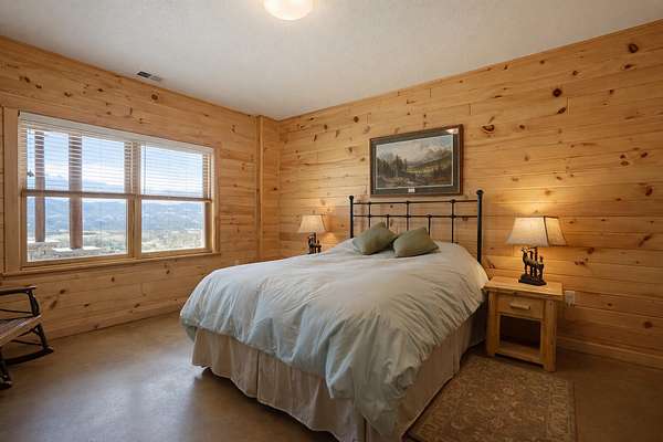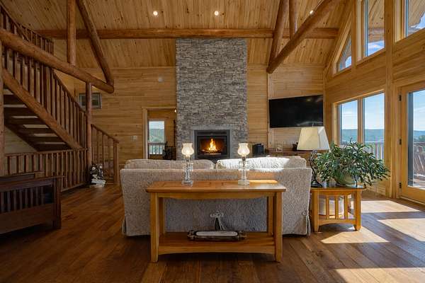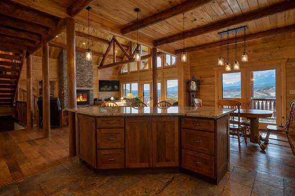 The Great Room highlights a wall of windows and El Dorado Stone fireplace with Lopi wood-burning insert. Gourmet kitchen includes rustic alder cabinets, upgraded granite, KitchenAid appliances, copper farm sink, and breakfast nook. Dining room has built-in cherry wood hutch with wine chiller and gun cabinet. Primary bedroom with sitting area and views leads to en suite ¾ bath with double sinks, tiled shower, separate toilet, and two walk-in closets. Laundry includes large pantry and "smart" Samsung washer/dryer. The walk-out basement has stained concrete floors, 9 ft ceilings, Lopi woodstove, family room with second kitchen, storage, and mechanical room. Selected photos have been minimally AI enhanced to add night views, fires in fireplaces, etc.