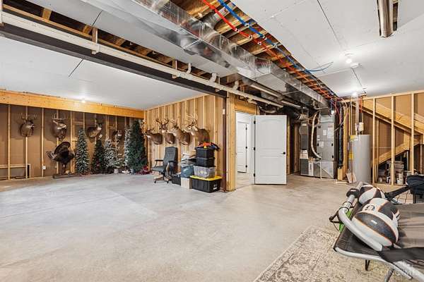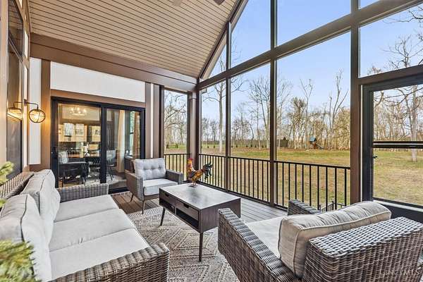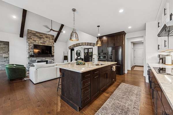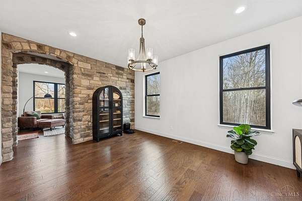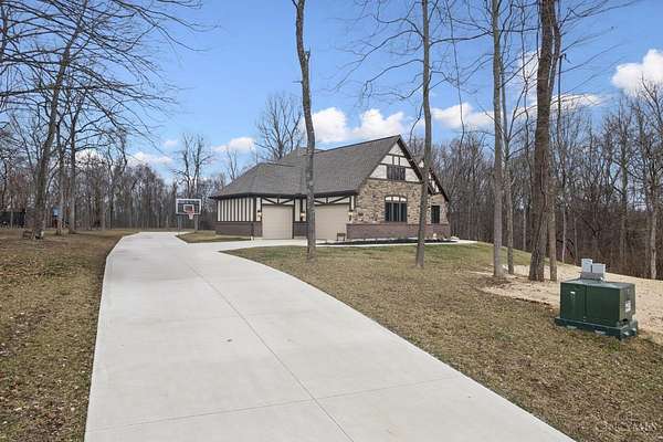 Welcome to the Reserve at Cole Rd! This exceptional custom Justin Doyle home spans just over 9 acres and offers 4,000 sq ft of refined living. Framed by stone walls and a private wooded setting, the dramatic arched entry opens to soaring ceilings, an open floor plan, and exquisite craftsmanship throughout. The living room features vaulted beam ceilings, a handcrafted stone fireplace, and expansive windows with serene views. The gourmet kitchen shines with a large quartz island, custom tile, walk-in pantry, and premium KitchenAid appliances. The main level includes a guest suite and a luxurious first-floor primary retreat with dual walk-in closets and a spa-like bath. Additional spaces include a study with stone fireplace, flexible dining or library room, mudroom with built-ins, and first-floor laundry. The finished lower level adds a family room, bedroom, fitness or office area, and baths. Extensive land improvements complete this remarkable estate.
