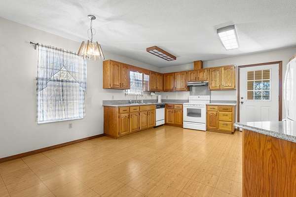 - Blinds, Ceiling Fans, Eat-In Kitchen, Electric Cook Top, Electric Range, Fireplace, Kitchen/Dining Combo, Living Room, Separate Dining Room, Walk-In Closet(s), Wood Cabinets, w/ Hookups