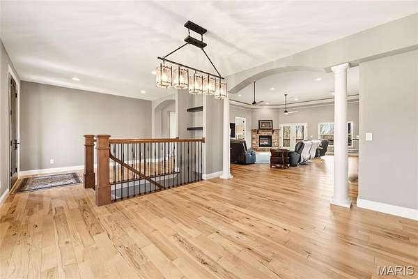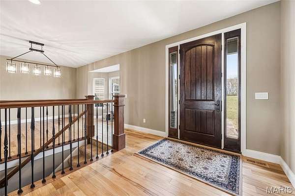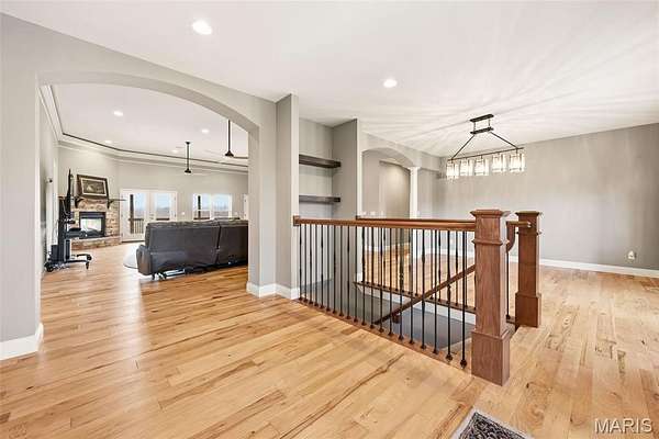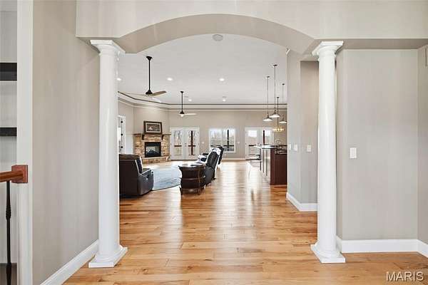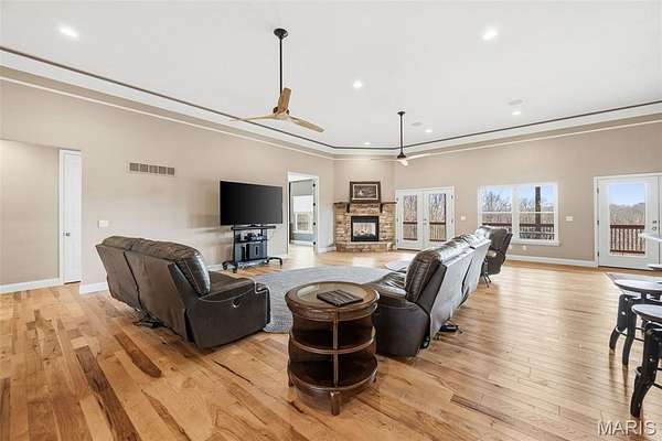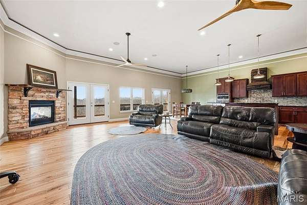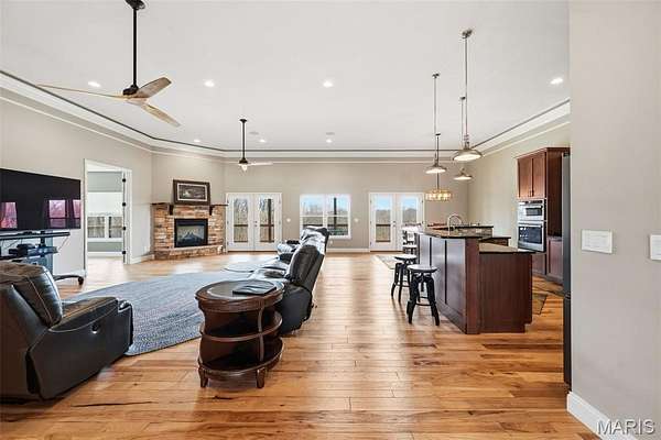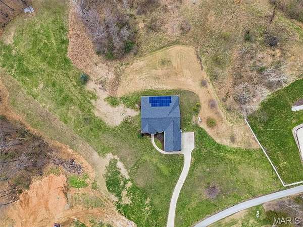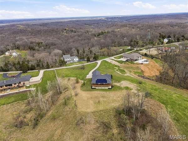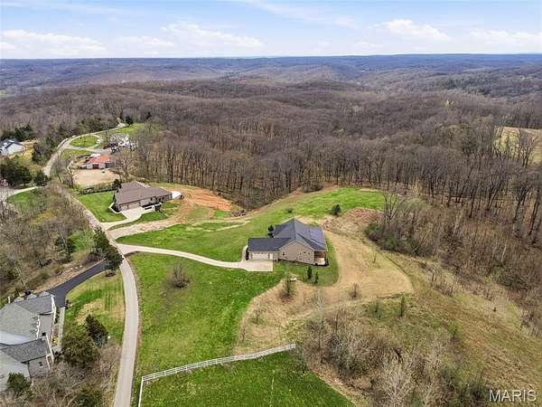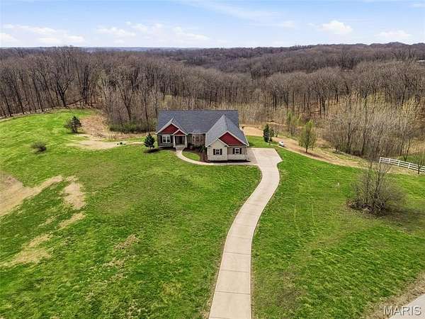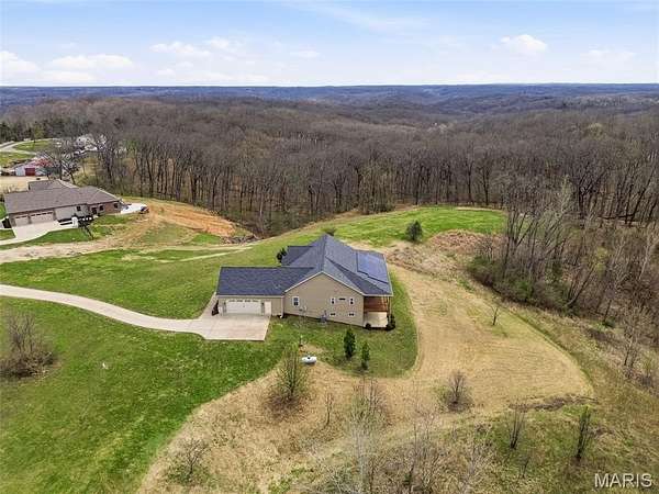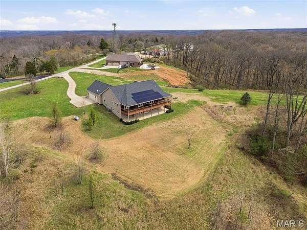 Welcome to this massive and luxurious Ranch home with beautiful 3/4" Hickory hardwood throughout the main floor living home. Massive laundry room off of the garage is accessible by a ramp. This house is wired with Spectrum fiber internet for trusted internet at all times. Incidental lighting behind crown molding in the Great Rm and the Primary Bedroom give excellent lighting options. LAN lines have been ran to the Office, Primary Bedroom and 2 in Great Rm. House has Origin Speaker system installed, for covered deck, Great Rm, (2) Great Rm (3) Primary BR, and 1 in Primary Bath. Great Rm is wired for surround sound. HEOS system in basement with remote runs the whole house. Basement is walk out with a massive, covered patio. The Great Rm is open to the Kitchen and Breakfast Rm, separated by HUGE semi-octagonal double tiered Center Island with electric. The Breakfast Rm and Great Rm walk out to the covered deck with speakers in ceiling and see through fireplace. Granite counter tops, gas cooktop with vent, wall oven and microwave is a cooks dream. Regardless if you cook or not you will LOVE this beautiful home with private Office. Beauty is everywhere. The garage has an 8ft. door. The giant oversized front wood door welcomes you to this magical home. Basement has a HUGE work bench area, is a walk out and waiting for your finishes. The view is breathtaking. All of this and so much more including solar panels on roof electric bill is approx. $100 p/m in winter and no bill April through November plus Ameren buys back what you don't use!