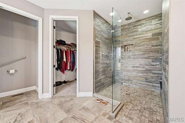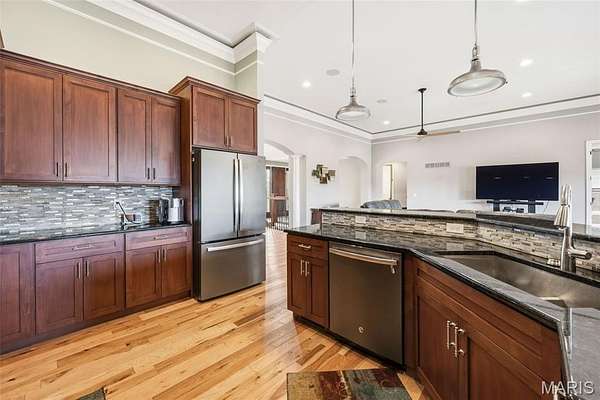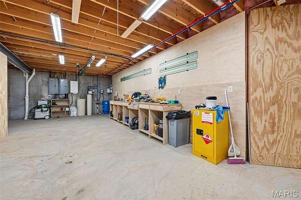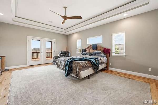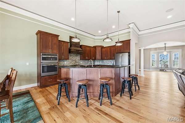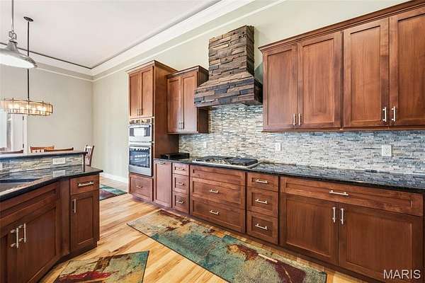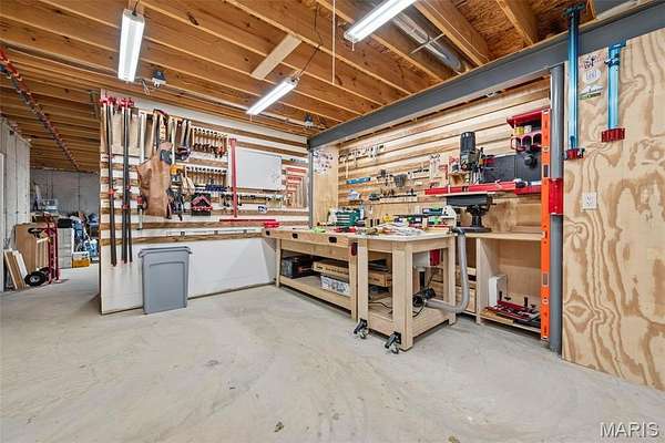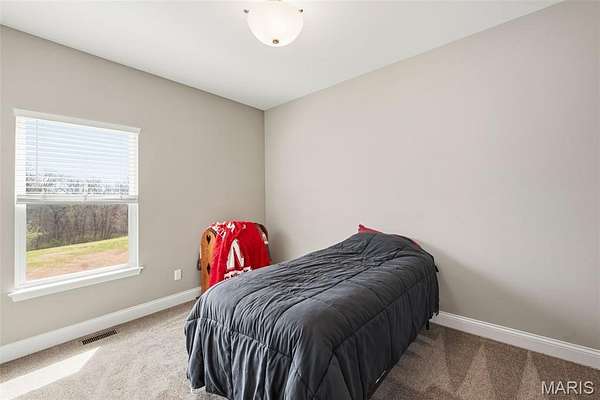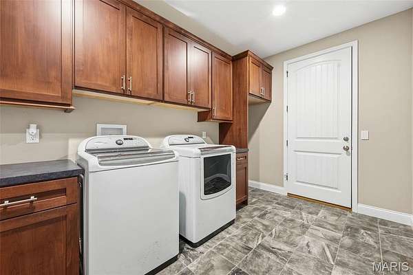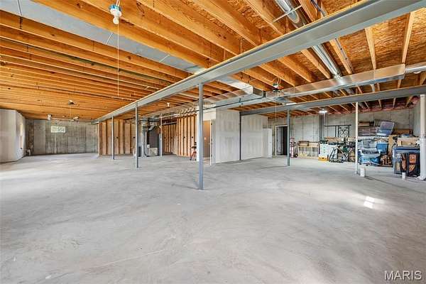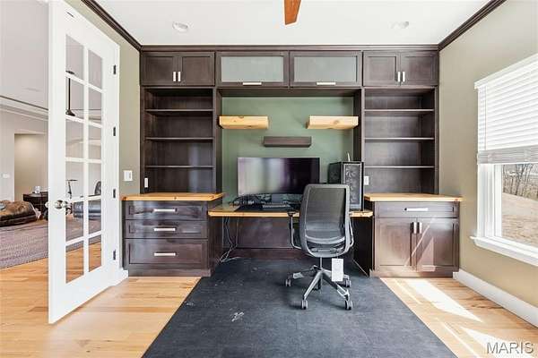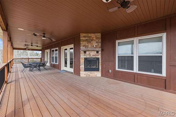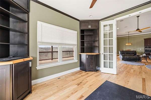 Welcome to this massive and luxurious Ranch home with beautiful 3/4" Hickory hardwood throughout the main floor living home. Massive laundry room off of the garage is accessible by a ramp. This house is wired with Spectrum fiber internet for trusted internet at all times. Incidental lighting behind crown molding in the Great Rm and the Primary Bedroom give excellent lighting options. LAN lines have been ran to the Office, Primary Bedroom and 2 in Great Rm. House has Origin Speaker system installed, for covered deck, Great Rm, (2) Great Rm (3) Primary BR, and 1 in Primary Bath. Great Rm is wired for surround sound. HEOS system in basement with remote runs the whole house. Basement is walk out with a massive, covered patio. The Great Rm is open to the Kitchen and Breakfast Rm, separated by HUGE semi-octagonal double tiered Center Island with electric. The Breakfast Rm and Great Rm walk out to the covered deck with speakers in ceiling and see through fireplace. Granite counter tops, gas cooktop with vent, wall oven and microwave is a cooks dream. Regardless if you cook or not you will LOVE this beautiful home with private Office. Beauty is everywhere. The garage has an 8ft. door. The giant oversized front wood door welcomes you to this magical home. Basement has a HUGE work bench area, is a walk out and waiting for your finishes. The view is breathtaking. All of this and so much more including solar panels on roof electric bill is approx. $100 p/m in winter and no bill April through November plus Ameren buys back what you don't use!