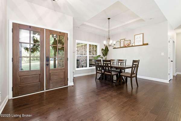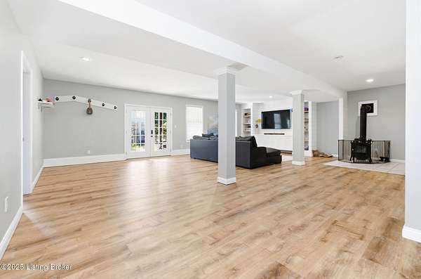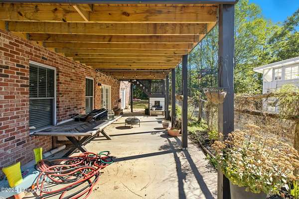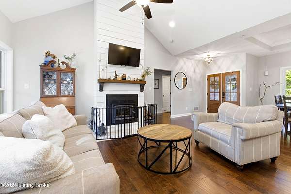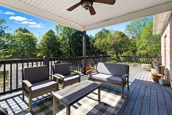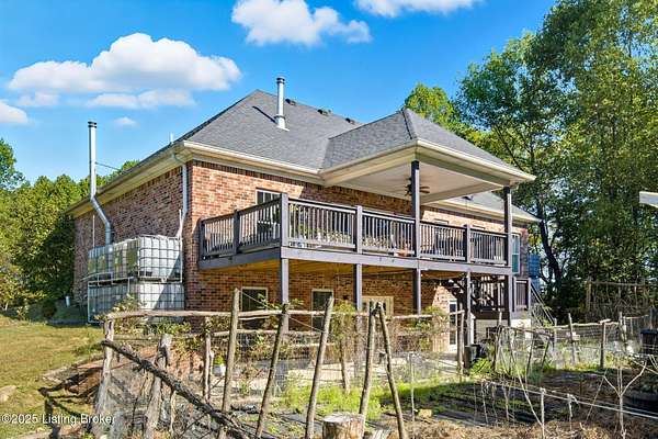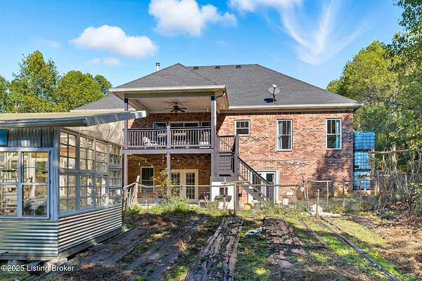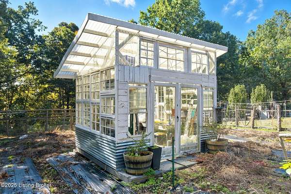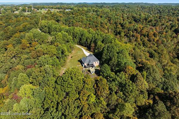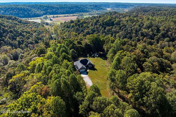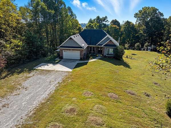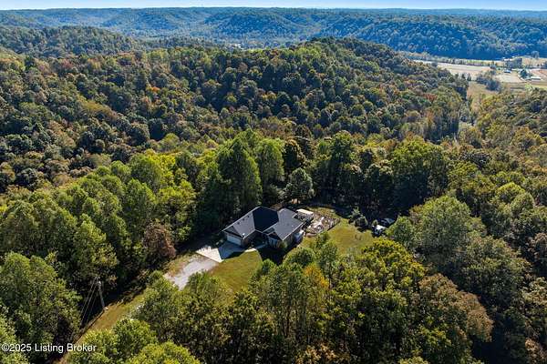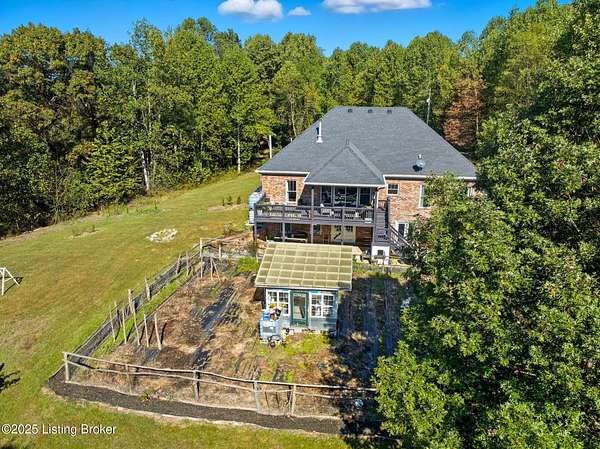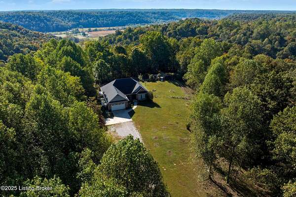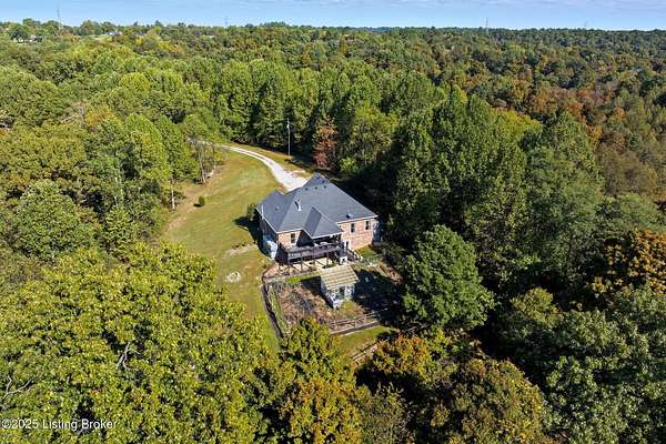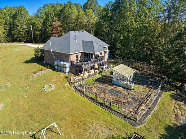 Discover your private homestead retreat located 35 minutes from Louisville! Tucked away off the main road, this hidden gem offers the perfect balance of seclusion and convenience - near Jefferson Forest and the scenic Blevins Gap Road. Set on 20.55 wooded acres, this property invites you to experience a homestead lifestyle surrounded by nature. Built in 2017, the stylish walkout ranch combines modern design with rustic charm. The open floor plan features 4 bedrooms and 3 full baths, showcasing hardwood floors throughout the main living areas. The vaulted ceiling in the general living area creates a spacious, airy feel, while the tray ceiling over the dining area adds an elegant touch. Both the main level and lower level include wood-burning stoves, offering cozy warmth on cool evenings. Step onto the inviting front porch to enjoy peaceful mornings, or relax and entertain on the huge rear deck and lower-level patio, both offering stunning views of the surrounding woods. Ready for a self-sufficient lifestyle, the property includes a rainwater harvesting and irrigation system, a large natural fenced garden area with greenhouse, a chicken coup, and livestock pens. For outdoor enthusiasts, explore 20 acres of hunting land featuring abundant deer and turkey. The ultimate private retreat perfect for those seeking a modern homestead lifestyle surrounded by natural beauty and quiet.