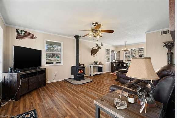 The home is equipped with a wood stove that can heat the entire house, providing cozy warmth during the colder months. There's also an HVAC unit for year-round comfort.