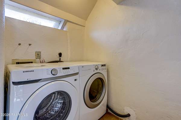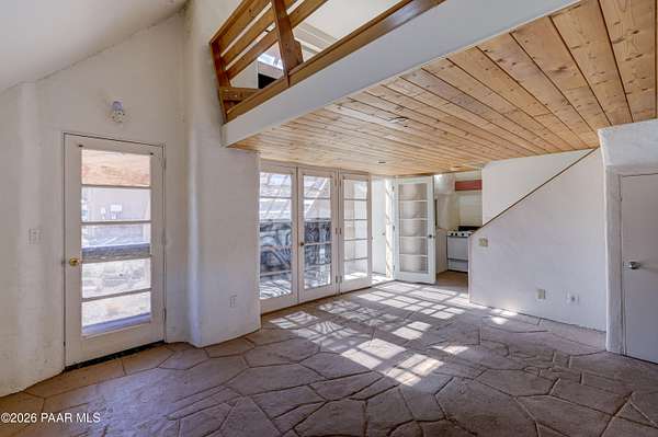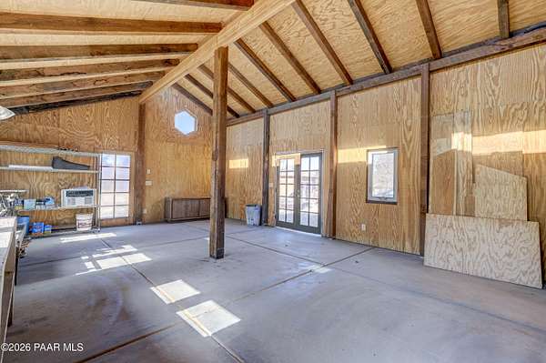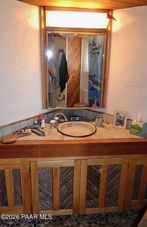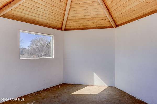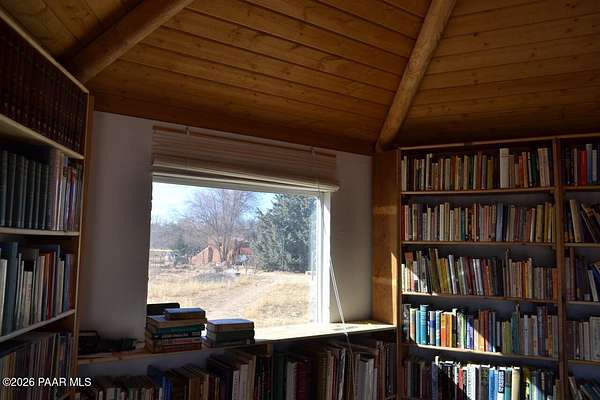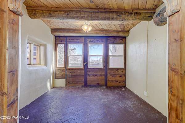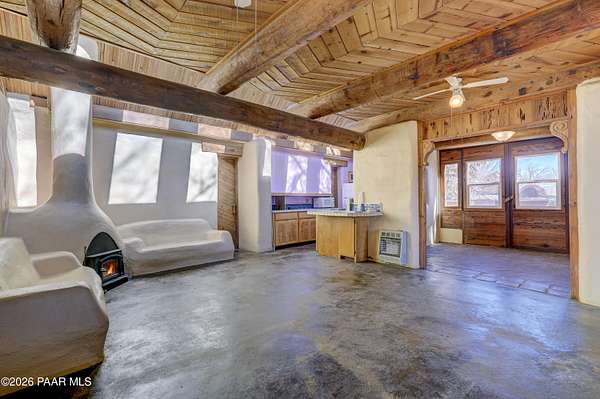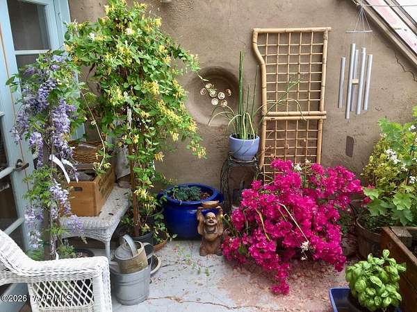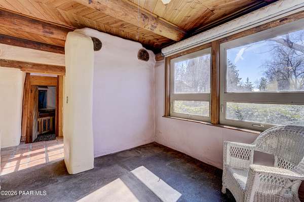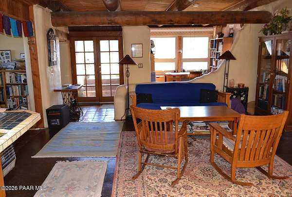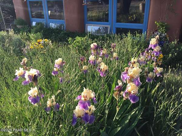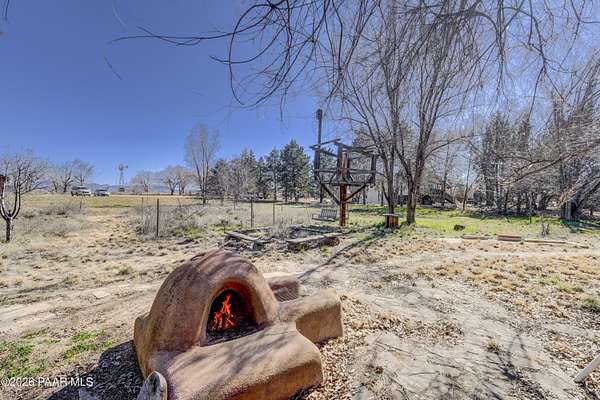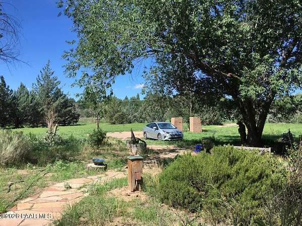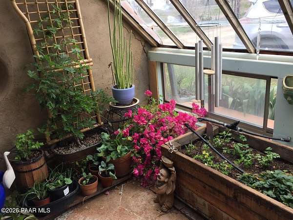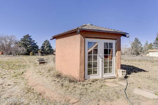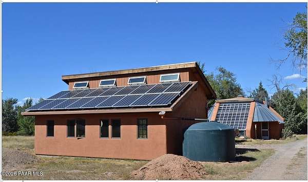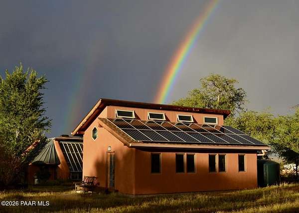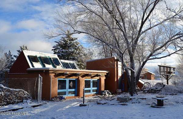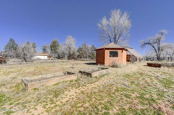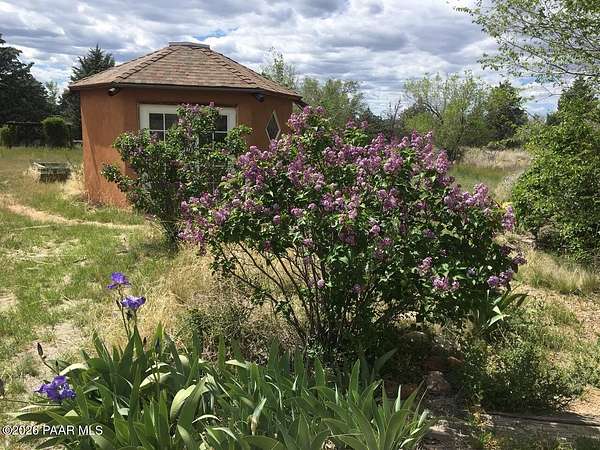 Charming Adobe Retreat on over 2 Verdant Acres in Chino Valley. Welcome to a one of a kind adobe sanctuary nestled on just over 2 lush, useable acres in the heart of Chino Valley. This unique property offers a rare blend of rustic style, sustainable living, and timeless Southwest craftsmanship. The custom-built adobe home features handcrafted adobe walls, hand-carved wood beams and a stunning wood-burning fireplace and sitting area that anchors the open-concept living space with warmth and charm. Designed for year-round comfort, the home also boasts a durable metal roof and passive solar design for energy efficiency. In addition to the main residence, the property includes a spacious and beautifully constructed workshop powered by the owned solar and a traditional storage hogan, and a truly special bonus! A historic greenhouse/guest quarters, designed by renowned local architects Bill Otwell and Michael Frerking. This sustainably built structure benefits from thoughtful solar gain and offers a serene and functional space for guests, studio use, or expanded gardening potential. Perfect for gardeners and nature lovers, the land offers Chino Vallely's fertile soil, ample sunshine, and a productive well at 15 GPM, making it a dream for those seeking a more self-sufficient lifestyle. Whether you're looking for a peaceful homestead, a creative retreat, or a property with deep architectural character and heritage, this adobe estate is a rare gem that must be seen to be fully appreciated!