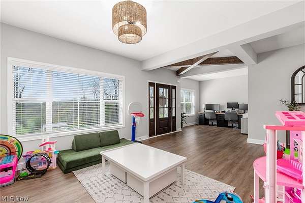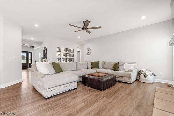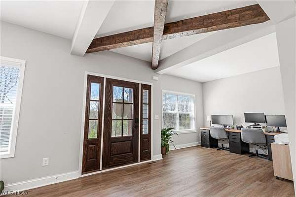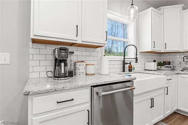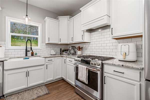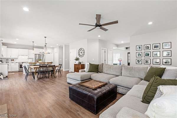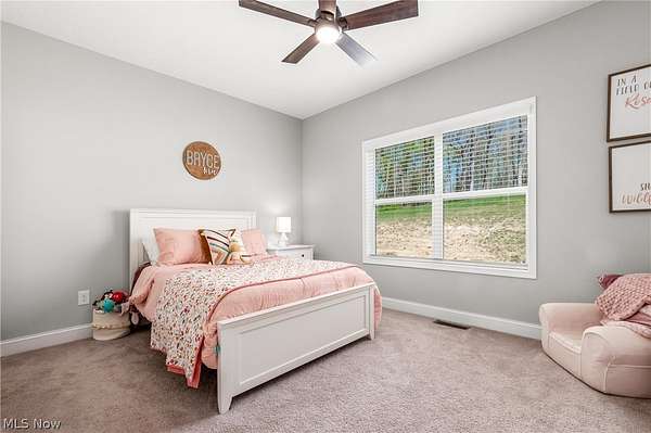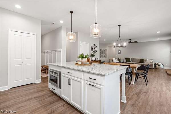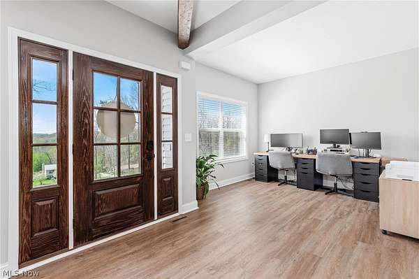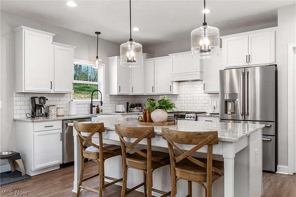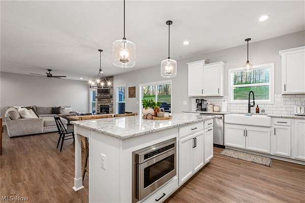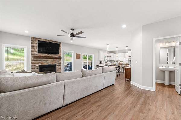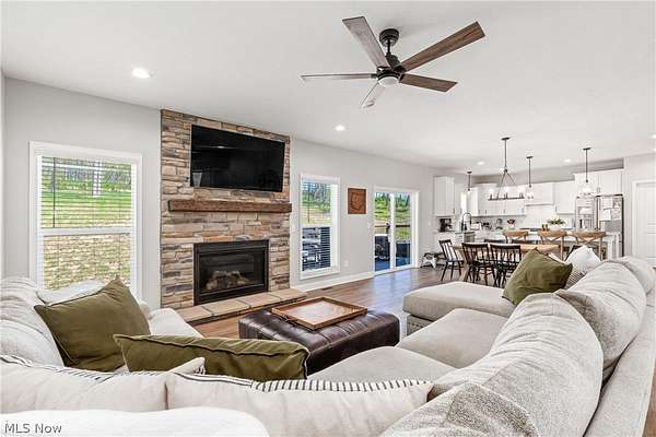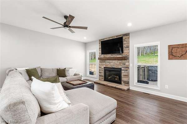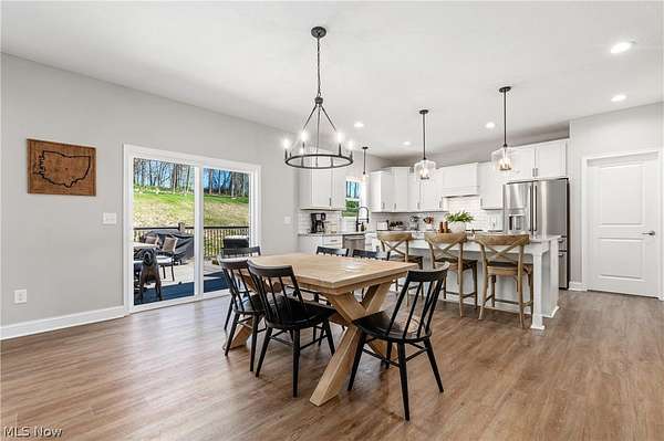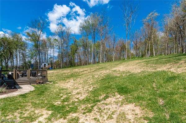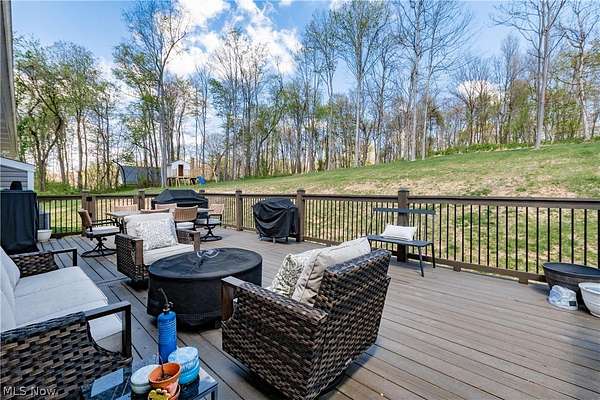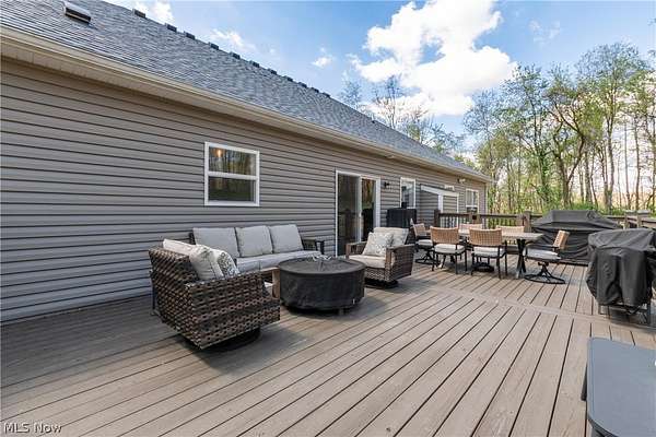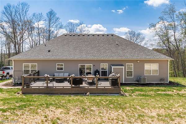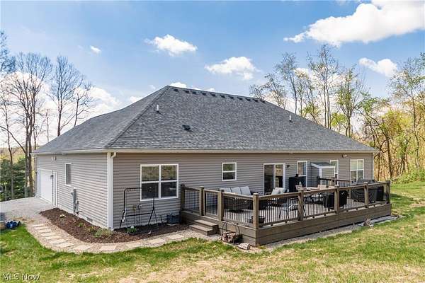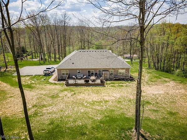 This custom-built modern ranch home delivers a striking blend of comfort, style, and thoughtful design across 5.02 private, wooded acres in the highly sought-after Northern Local School District. A welcoming foyer introduces the open, airy layout and leads to a bright home office. Just off the foyer, you'll also find a dedicated dining area, ideal for gatherings and everyday meals. The spacious living room features a beautiful stone fireplace and flows seamlessly into the gourmet eat-in kitchen. Designed for those who love to cook and entertain, the kitchen includes a large center island with breakfast bar seating, GE Cafe stainless steel appliances, a dual-fuel range, granite countertops, a farmhouse-style sink, and a convenient pantry. A well-appointed mudroom/laundry room offers a folding station and wash sink, while a stylish main-level powder room adds convenience for guests. The luxurious primary suite serves as a private retreat, offering two walk-in closets and a spa-inspired bath complete with a soaking tub, double-sink vanity, and walk-in shower. Three additional spacious bedrooms and a full hall bath complete the main level. The full, unfinished lower level provides endless opportunities for future expansion or storage. An oversized attached two-car garage adds practicality, and the expansive back deck overlooks peaceful wooded views. A charming children's outdoor playhouse adds a delightful touch for families seeking both comfort and recreation. With easy interstate access for commuters, this modern ranch home offers privacy, quality craftsmanship, and a beautifully serene setting.