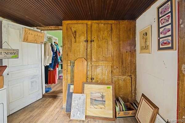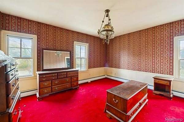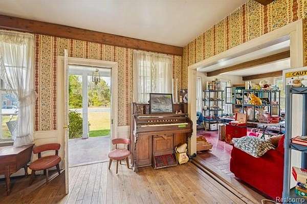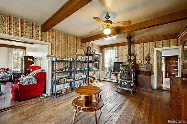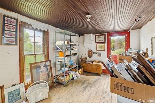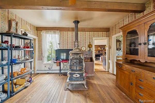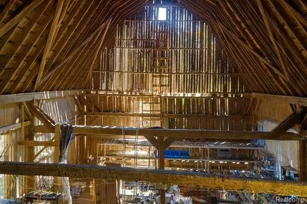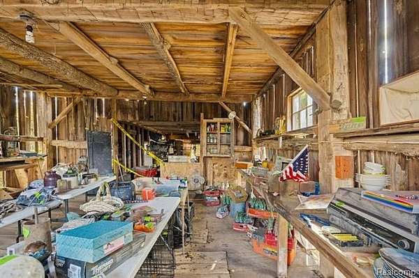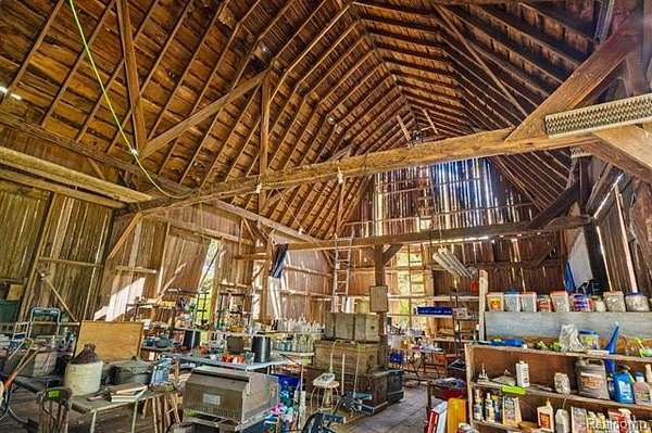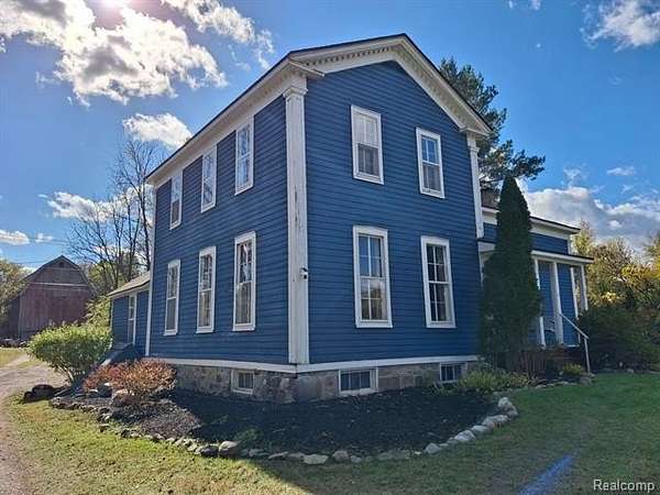 Step back in time to this enchanting historical Johnson Farmhouse, built in 1857 and nestled on 6.5 beautiful acres featuring rolling hills and gentle elevation changes - not just flat land, but a truly picturesque setting. Multiple outbuildings offer endless potential for hobby farming, workshops, or storage - including a 1,500 sq ft multipurpose greenhouse with two garage doors, perfect for gardening, storage, a workshop, or even additional parking. Enjoy the serene pond and lake views across the street, adding to the peaceful and scenic charm of this one-of-a-kind property. This cherished 4-bedroom, 1-bath farmhouse exudes timeless character. Spend quiet mornings on the covered screened-in sunroom, or cozy evenings gathered around the potbelly stove, watching the flames glow and fill the home with warmth. The farmhouse kitchen, centered around its natural wood-burning fireplace, has long been the heart of family gatherings - from all-day holiday cookie bakes with nieces and nephews to memorable meals shared around the table. Inside, original millwork and tall windows fill the home with natural light, showcasing the craftsmanship of a bygone era. While the home does not feature modern updates and awaits restoration, its soul and structure offer a rare opportunity to bring new life to a historic treasure. Step outside and explore the multiple storage barns, the expansive greenhouse, and open acreage ideal for gardens, animals, or future expansion. Whether you dream of a peaceful retreat, a working homestead, or a place to write your next chapter, this property offers the space and serenity to make it your own. *Property is staged for an Estate Sale - Treasures abound* *Air compressor included