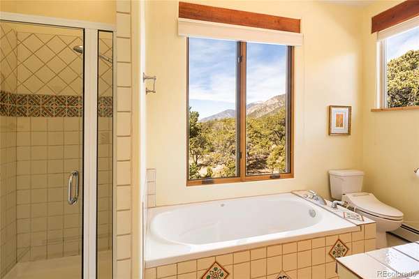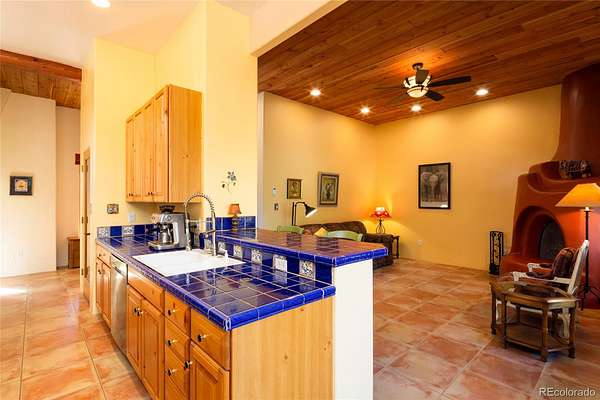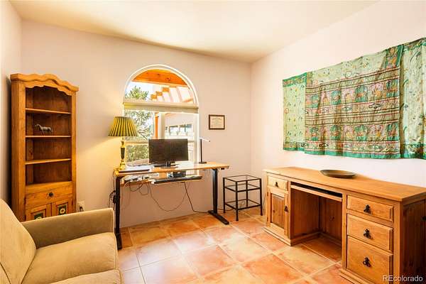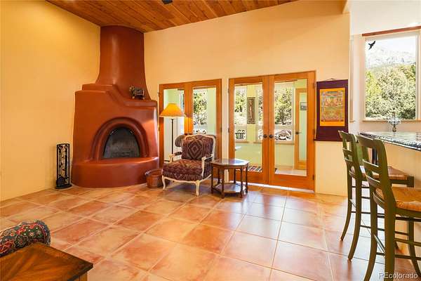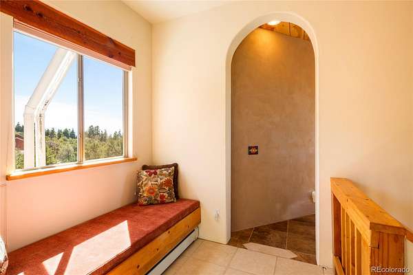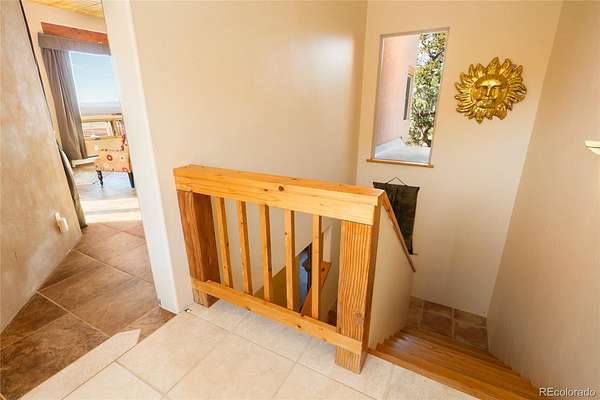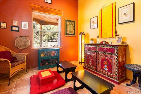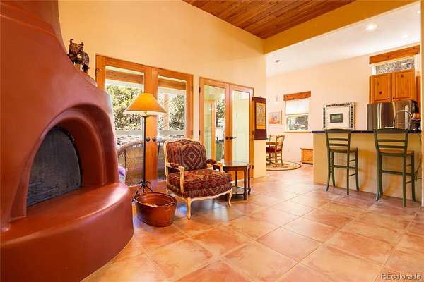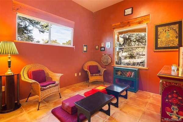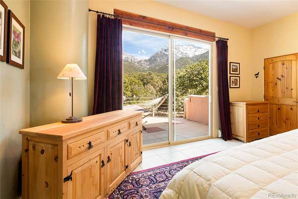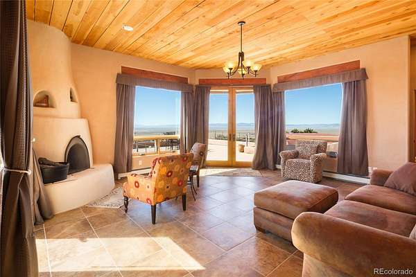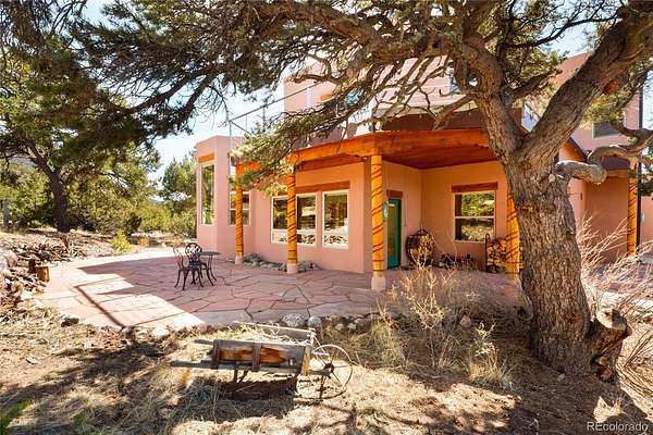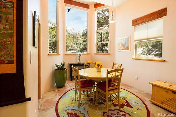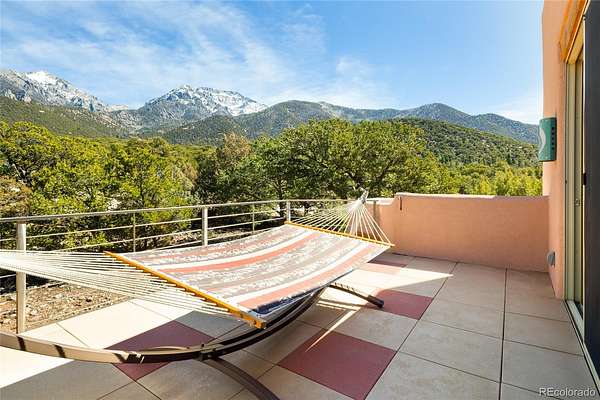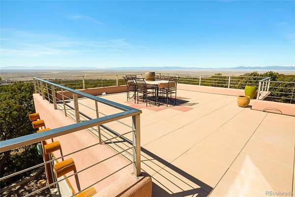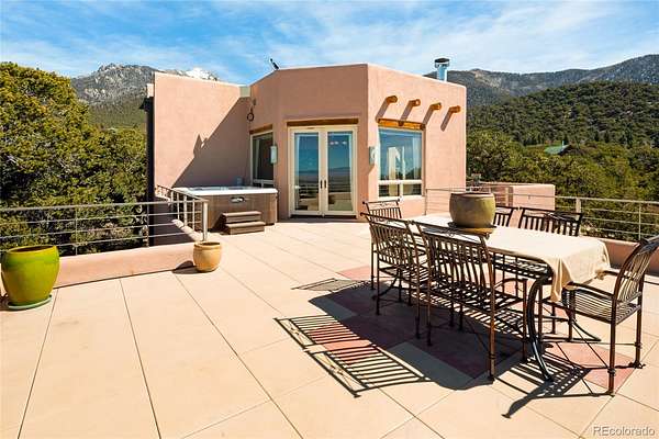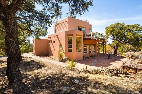 Beautiful 3bd/3ba Lee Mitchell Home designed and built home on 2.29 acres backing greenbelt and across the street from Willow Creek, and remodeled with architectural designs by Tokyo artist/designer Hisa Ota. The expansive mountain and valley views are witnessed in all directions of this beautiful layout, and protected from neighbors by the acreage and trees. The house sits perched in the foothills of the Sangre De Cristo mountains, and is surrounded by an impressive flagstone patio on three sides. New Solar Thermal Drainback system for radiant floors, keeping the heating costs very low. Downstairs the open, natural light filled floorpan accommodates a sizable Spanish tiled foyer opening into the living room, fitted with a large kiva fireplace and a glass wall leading to the sunroom. The dining room enjoys huge widows with mountain views, leading to the ample cabinet lined kitchen and glass-fronted pantry. Stainless appliances are all new within the last 3 years, and a whole house filter keeps the water as pure as possible. Down the hall include two ample sized bedrooms, full bath, and cork-floored flex room (currently used as library/yoga studio/office space) leading into insulated two car garage. Up the oak stairs to the window surrounded landing/seating, to the primary suite, complete with two double sets of closets, sliding doors leading to private 300 sqft mountainview balcony, and a lovely 5 piece bathroom with bathtub views and Toto bidet. Across the hall, the expansive views of the valley surround the Kiva heated space, and open in two directions/sliding doors to a 800 sqft tile deck and pristine 4 person hot tub. Outside, tiered landscaping provides easy opportunity for a gardener to enjoy. Membrane roof on majority of the home replaced last year with 20-40 yr lifespan, and new synthetic stucco with 20+ year lifespan 5 years old. This home is a must see gem, check out via virtual tour or in person!