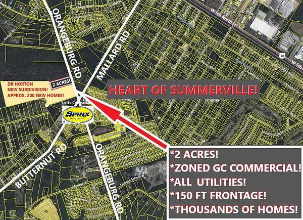 ATTENTION Developers/ Investors/ Business Owners! *2 Acres* Zoned GC (General Commercial Dorchester County) - Less then 700 Feet from the major intersection of Orangeburg and Mallard Rd. (E Butternut Rd). (Lotts Crossroads!) With the NEW SPINX CS/Gas Station! -- 150 Feet of Frontage!! - ALL UTILITIES are going in as we speak, including Public water and Sewer! -- Property has a man-made pond, and adjacent to a DR HORTON- NEW HOME development!! - This is a No-brainer! - (NO Wetlands on lidar satellite!) - Mobile home & storage bld. on property will convey in AS-IS condition (LAND VALUE ONLY) *Family Member currently living and working in home *Contact LA FOR ALL SHOWINGS. PLEASE NOTE! - No studies have been done - We have a neighborhood Plat posted to Documents - ALL the information we have been able to obtain from the sellers, and any/all third-party organizations, including but not limited to city/county and other entities, has been posted to this MLS (under "Documents"). If you do not see the item in question (Plat, Survey, Wetlands JD's, Elevation Cert, Etc., it is because we do NOT have them. -- Unless specifically noted, these items in question, will be the buyer's responsibility, either during the DD period or post-closing. Thank you. - Buyer is responsible for all utilities DD and tap fees.
