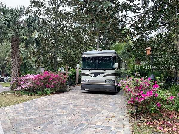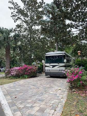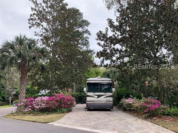 BEAUTIFUL RV lot #233 has a paver pad and can accommodate a 45' coach and two vehicles. This lot is nicely equipped with a shed, 2 large cantilever umbrellas, 2 recliner chairs with cushions, swing with cusions, dining table with 4 chairs with a umbrella, flat top grill, and a serving cart. Hilton Head Island Motorcoach Resort is located in the heart of Hilton Head Island and is a luxury RV resort designed for the conveniences and enjoyment of class A, C andSuper C Motorcoaches only. The resort consists of 50 acres of woodland and lush landscape setting accented with live oaks dripping withSpanish Moss, palms trees, ferns and flowering shrubs. The resorts amenities include tennis courts, pickle ball, shuffleboard, swimming pool,hot tub, clubhouse, laundry facilities, fitness center, basketball courts, playground, dog park, Wi-Fi, cable, daily trash pickup, lawn maintenance,water & sewer. Hilton Head Island Motorcoach Resort is a short bike ride to Coligny Beach, restaurants and island shopping.