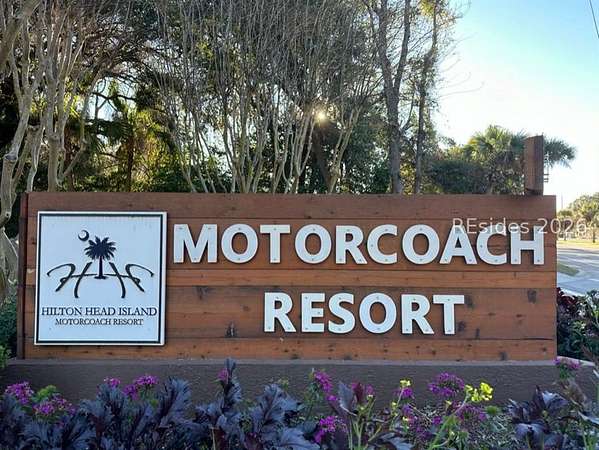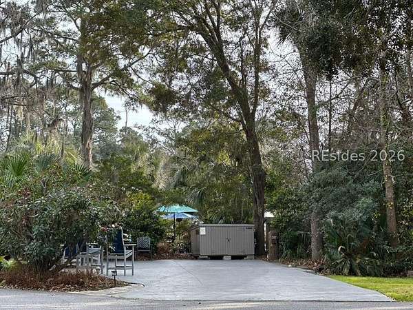 Welcome to Lot #387! RARE CORNER RV LOT in the heart of the Hilton Head Island Motorcoach Resort is ideally located in the "Clubhouse" section of this gated luxury RV community on Hilton Head Island, South Carolina. Positioned just steps from premier amenities, Lot #387 offers exceptional convenience, rental appeal, and refined outdoor living. The stamped concrete pad accommodates a 45-foot motorcoach plus a mid-sized vehicle, and the EASY-TO-ENTER configuration makes arrivals smooth for both owners and renters. The corner positioning enhances accessibility while providing added privacy. Designed for entertaining, the property features multiple seating areas that create an inviting gathering space where you can relax and enjoy the Lowcountry lifestyle (furniture as seen will not automatically convey without additional negotiations). Beautiful perimeter landscaping offers privacy from the road while preserving views of the adjacent green space, and direct access to the clubhouse path just across the street adds unmatched convenience. The lot is equipped with a full irrigation system, outdoor lighting, and a storage shed for added functionality and value. Enjoy cable, Wi-Fi, water, sewer, and trash pickup as part of the conveniences included within the resort. Hilton Head Island Motorcoach Resort is an amenity-rich community designed exclusively for Class A, Class C and Super C motorcoaches. Residents and guests enjoy a heated pool and hot tub, pickleball and tennis courts, fitness center, clubhouse, and dog park, along with an active social calendar. Located just minutes from Coligny Beach, Atlantic Ocean access, miles of bike paths, over 250 restaurants, golf courses, and island shopping, this property supports both personal enjoyment and rental opportunities. Recognized by Condé Nast Traveler readers as the Best U.S. Island for nine consecutive years, Hilton Head Island continues to attract discerning buyers seeking resort-style ownership in a premier coastal destination. Let this unique CORNER LOT in Paradise provide you a home-base for exploring the island!