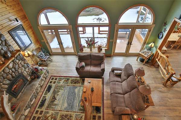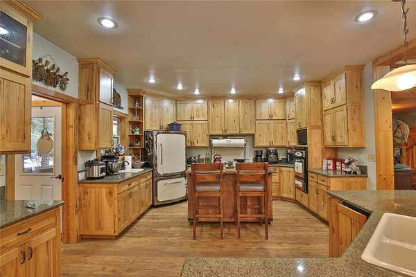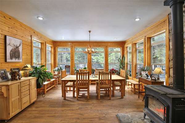 Meadows and Mountains Ranch boasts a beautiful custom, four-bedroom, 5,066-square-foot home with a chef's kitchen, corner office with windows, spectacular log staircase, four master suites, and lovely covered decks. The main floor has everything you need: a craftsman floor-to-ceiling fireplaces, a tongue-and-groove vaulted pine ceiling, and oversized Anderson clad windows that evoke the sense of living with nature. A lovely dining room is situated off of the kitchen and the master suite is located on the main floor with a jetted corner spa bath with a view. Generous master includes a three-quarter bath on the main floor. Dual master suites with three-quarter baths upstairs, complete with their own decks. A sitting area catwalk upstairs. The home & three-bay shop sit on 19 acres as well as the little 1927 guest quarters. That gorgeous mix of pasture and timber with privacy with an open feel. Plenty of room for our four-legged friends to roam. Close to the quaint town of Noxon, Montana.