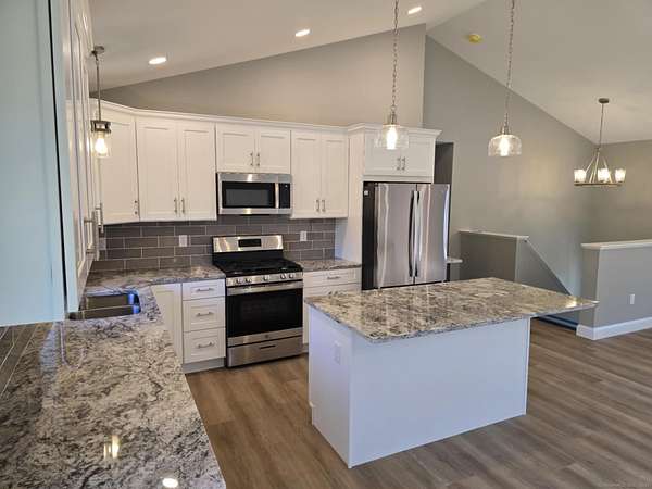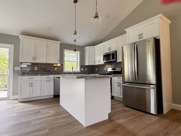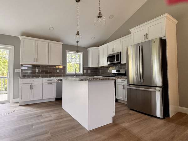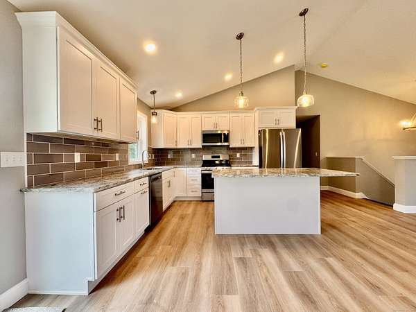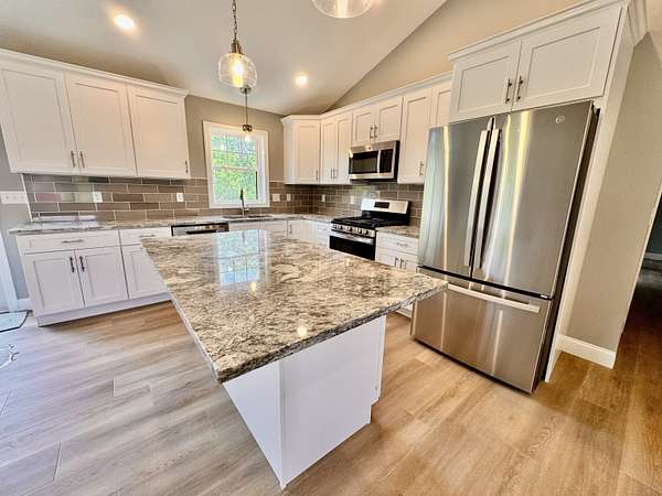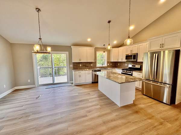 Looking for a brand new 4 bedroom 3 full bath home? Look no further. Come see all the fantastic and elegant features added to this oversized raised ranch style home. Starting with a paved driveway, leading up to the trex/maintenance free porch. Stylish upgraded black windows. This home is designed to relax in, and with its open floor plan and vaulted ceilings a great place to entertain in. Enjoy the beautiful 36" white cabinets w/crown molding, the 70"center island with granite counter tops, and G.E. stainless steel appliances. Open to the dining area with slider to the 10x16 deck, which overlooks the massive , level rear yard. Large furniture? No problem this spacious living room will accommodate it. Primary suite offers private full bath and walk in closet. The 2nd & 3Rd bedrooms on the main level. Another family/guest full bathroom on main level. Enter to the walk out lower level and you here's your 4th bedroom and full bathroom. 9' walls in lower level too. Separate laundry room. 2 car oversized garage perfect for storing your lawn equipment or work bench area. The yard is level, so go ahead and explore so many outdoor activities. You'll enjoy every bit of this new home, inside & out. Generator hookup 16 year Mitsubishi warranty. In walking distance to school and playground area with basketball courts & play equipment. 25x30 over sized garage