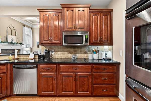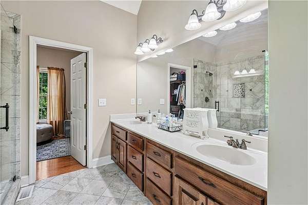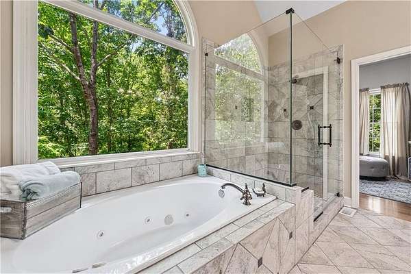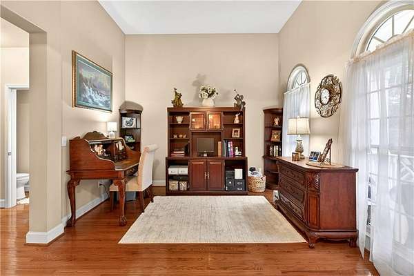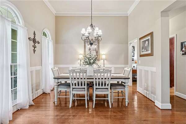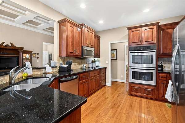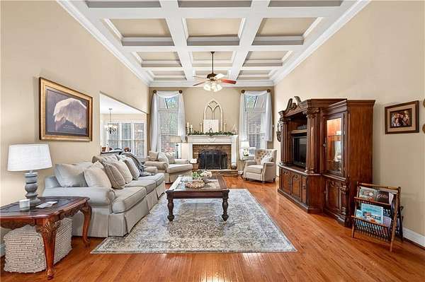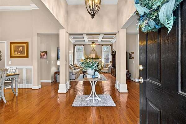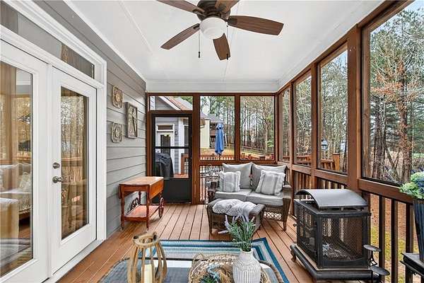 This custom-built, one-owner 4-bedroom, 3.5-bath ranch on a full daylight basement sits on a generous estate lot backing directly to Lake Allatoona, where you can literally walk to the water, and in the car you'll be less than one mile from beach and boat access. Privacy, space, and everyday adventure - all in one address. Inside, soaring coffered ceilings and a striking stone fireplace anchor the family room, flowing effortlessly into the breakfast area and a beautifully appointed kitchen with granite countertops, stainless steel appliances, and abundant storage. A separate dining room and dedicated office/formal living space offer flexibility for entertaining or working from home. The primary suite on the main level is a true retreat, featuring a vaulted tray ceiling and a thoughtfully updated spa bath with double vanities, a whirlpool tub, glass shower, and generous closet space. Step directly from this suite onto the screened porch and sundeck - your own quiet escape overlooking the backyard. Two additional bedrooms and a full bath complete the main floor. Upstairs, a private fourth bedroom and full bath with its own staircase create a flexible space that works effortlessly as a true fourth bedroom, guest retreat, tucked-away office, or bonus living area - plus easy attic storage access. The unfinished daylight basement is expansive, already stubbed for a bath, and ready for your vision. With two sets of French doors, two breaker boxes, and an ideal layout for finishing, it's an opportunity to instantly expand your living space (nearly double it!) and add value. Hardwood floors, crown molding, a large side-entry two-car garage, built-in laundry cabinetry, and a welcoming rocking chair front porch add charm and functionality throughout. Don't miss this one-of-a-kind opportunity - a ranch with an expansive daylight basement with tall ceilings like this is rare and a home of this scale and quality - with soaring ceilings and premium finishes - would cost significantly more to build today! Tucked among mature trees on a manicured lot, yet just minutes from Sweetwater Creek State Park, Big Door Vineyards, and all the conveniences of Cherokee County, this home is peaceful living in a location that's hard to beat!!