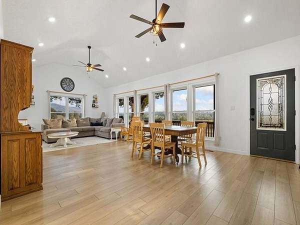 Step inside to find a large, inviting living area, newly updated flooring upstairs, and thoughtful finishes throughout. The home features a metal roof, covered porches, and a full back deck perfect for taking in the gorgeous panoramic views. A walk-out basement provides flexible living or recreation space, while the 2-car garage offers convenience and additional storage.