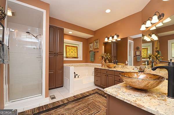 - Bookcases, Double Vanity, High Ceilings, Master On Main Level, Roommate Plan, Separate Shower, Tile Bath, Tray Ceiling(s), Walk-In Closet(s)