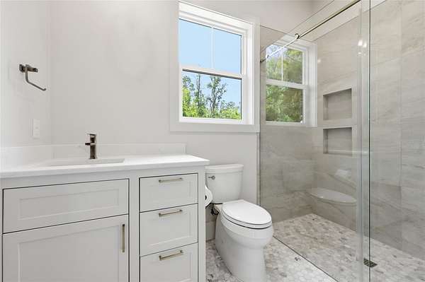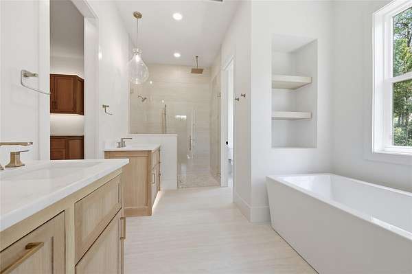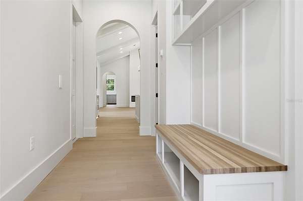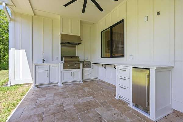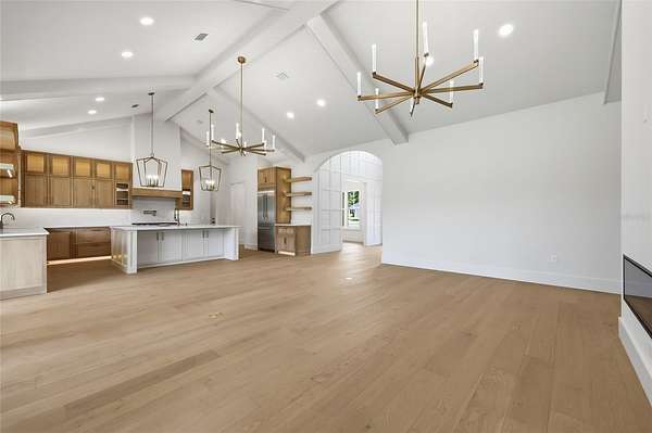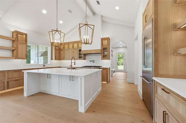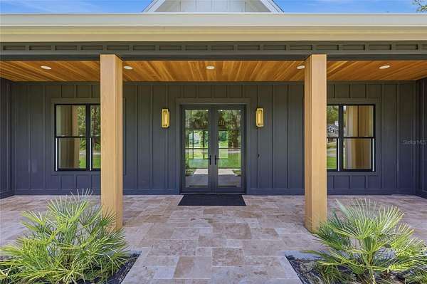 This brand-new custom-built residence offers 2,898 square feet of heated and cooled living space, with 4,248 total square feet under roof, and is thoughtfully designed for both everyday ease and elevated entertaining. The curb appeal makes an immediate impression with a travertine walkway, welcoming front porch, cedar-wrapped columns, and a cedar tongue-and-groove ceiling.