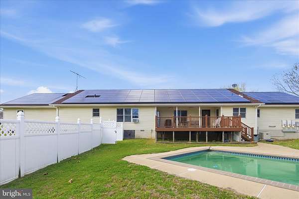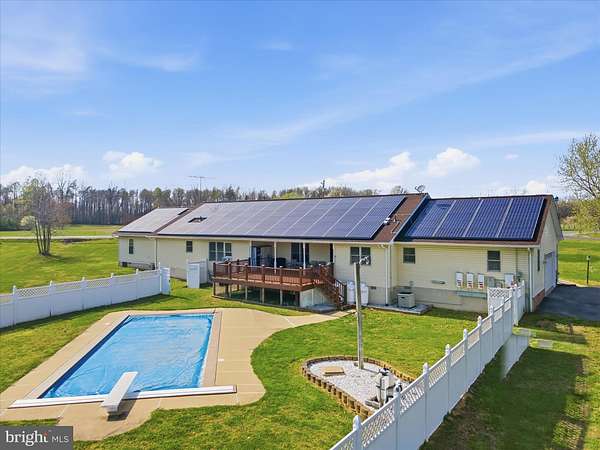 Welcome to this beautiful one-level living home offering an expansive 4,100 square feet on 3.21 private acres, situated on a large corner lot. No HOA. This spacious property features six large bedrooms, three full bathrooms, and one half bath, providing plenty of room for family, guests, or flexible living arrangements. Each bedroom includes a walk-in closet, offering ample storage throughout the home. The home offers a spacious family room, along with a separate living room and dining room, creating comfortable spaces for both everyday living and entertaining. An eat-in kitchen provides a casual dining option and a welcoming gathering space at the heart of the home. Step outside to enjoy a stunning in-ground gunite pool with an automatic cover, perfect for relaxing or hosting gatherings. The outdoor space also features a maintenance-free large composite deck, ideal for entertaining or enjoying the peaceful surroundings. The partially fenced backyard offers privacy and plenty of room for outdoor activities. Car enthusiasts, hobbyists, or those needing extra storage will appreciate the attached two-car garage as well as the impressive 32x40 detached garage that can accommodate up to six cars, which is heated with electric. Recent updates include a new roof installed in 2024 on both the main house and detached garage, an 80-gallon hot water heater installed in 2023, and owned solar panels that transfer to the buyer with no lease payments. Dual zoned HVAC system that ensures the home is always comfortable and efficient! The home also features a house humidifier for added comfort. This exceptional property offers the perfect blend of space, functionality, and outdoor enjoyment in a peaceful setting.
