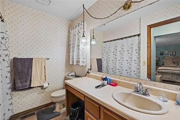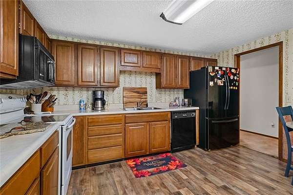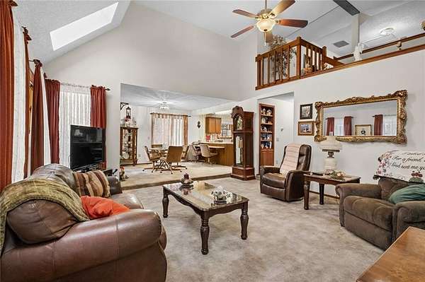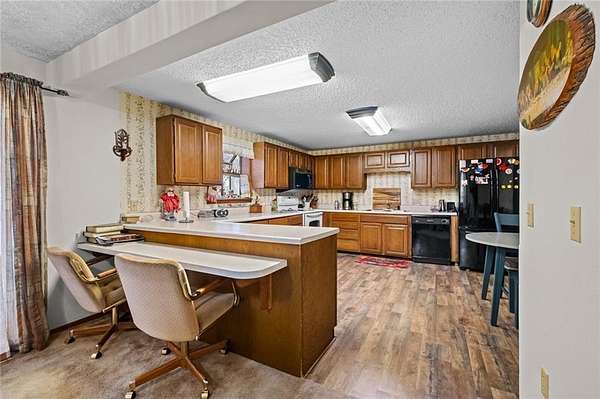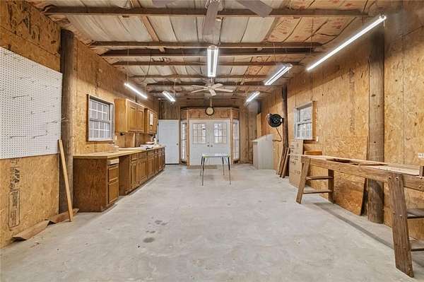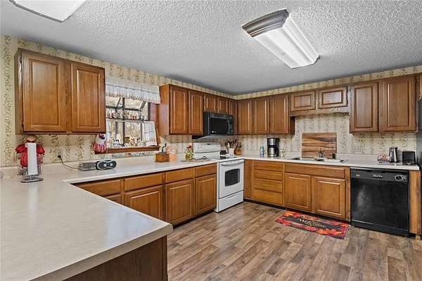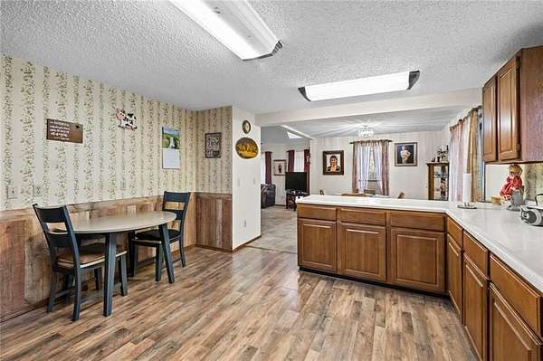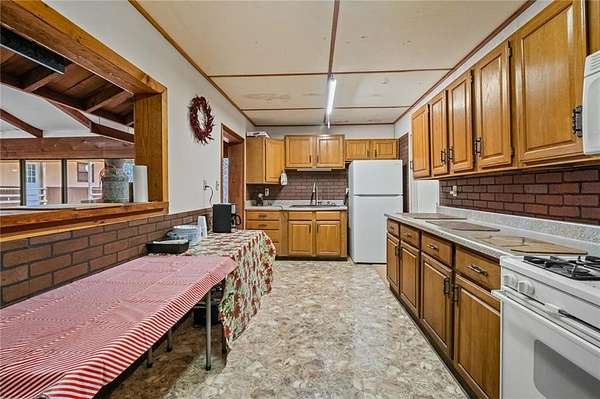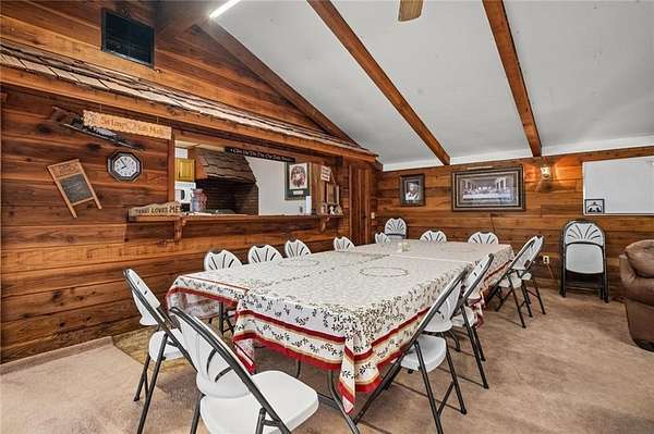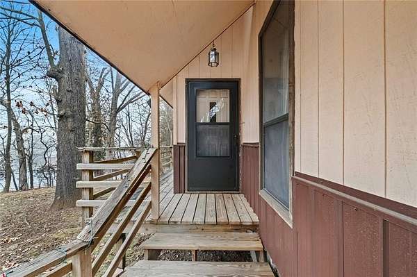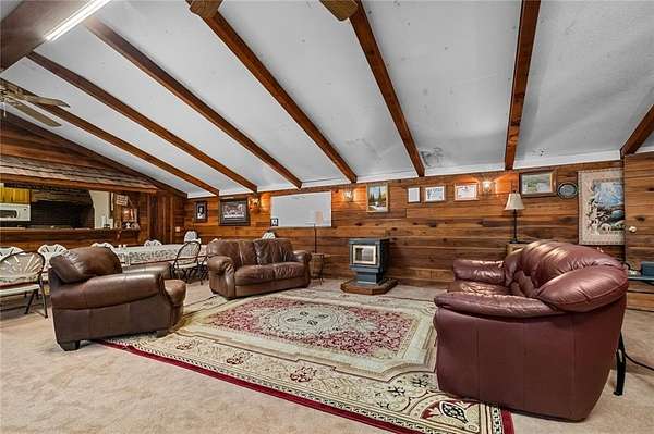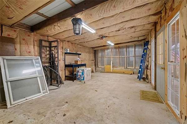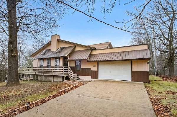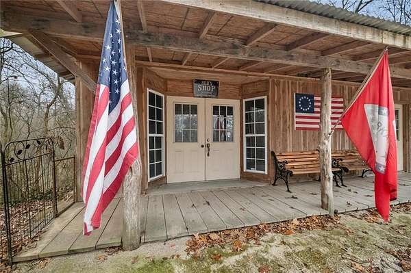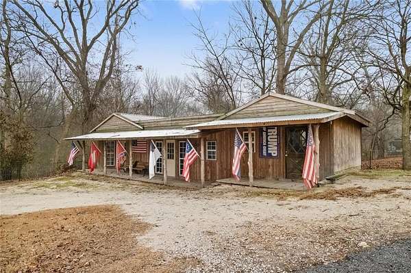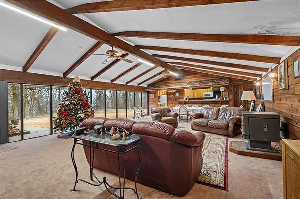 $10,000 in concessions with acceptable offer!! This charming property offers nearly 1.5 acres of serene countryside living, just minutes from downtown Gentry & the city park. This home has had recent roof & skylight inspections & repairs. Inside, you'll find a spacious living room with stunning floor-to-ceiling windows & exposed wood beams, creating a bright & inviting atmosphere. The eat-in kitchen is equipped with ample cabinet space, perfect for all your storage needs. With cozy carpet & wood laminate flooring throughout, this home offers both comfort & durability. Enjoy the outdoors from the wraparound porch overlooking the pond, or entertain guests in the unique party room featuring a covered front porch running the length of the building, along with a pellet stove, hot tub, & a grill in the kitchen. For your convenience, the main house includes a refrigerator, washer, & dryer. The workshop has an air compressor that conveys, along with an additional parking spot. The property is ready for your next adventure!