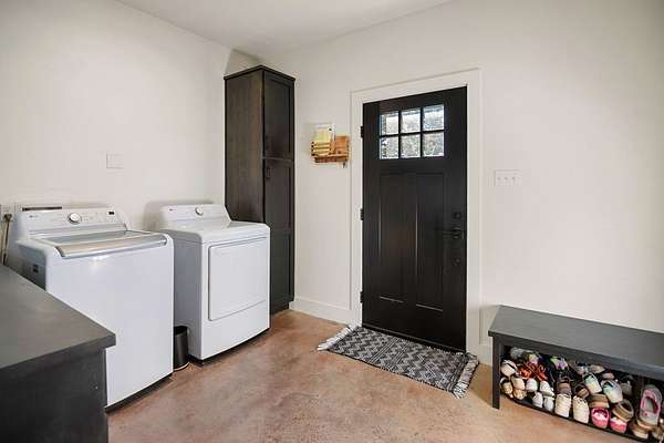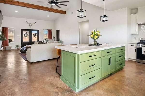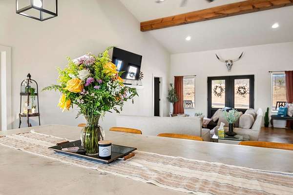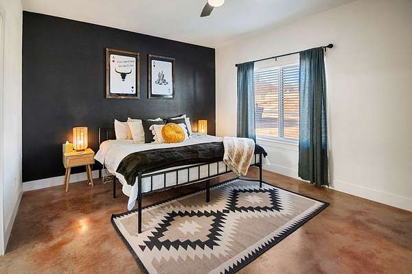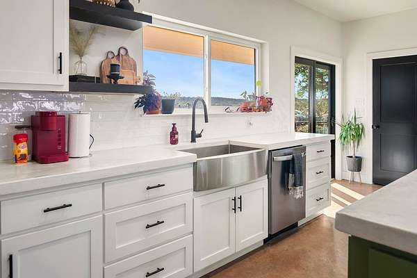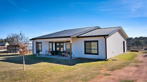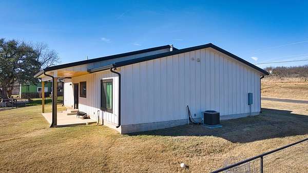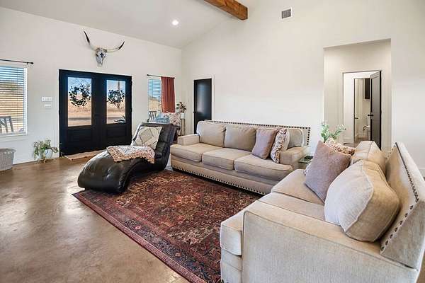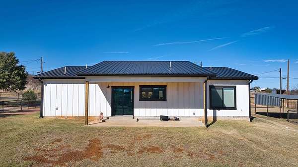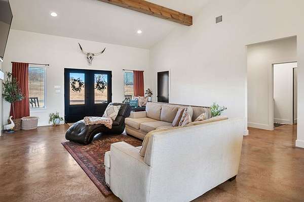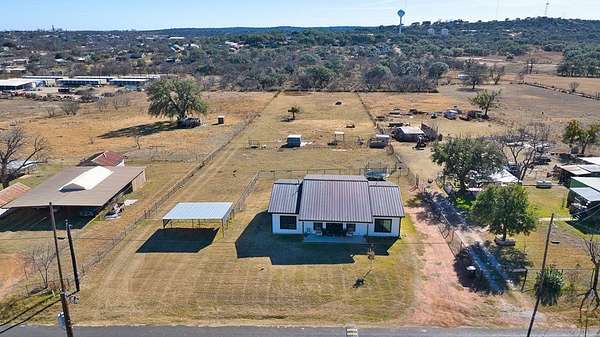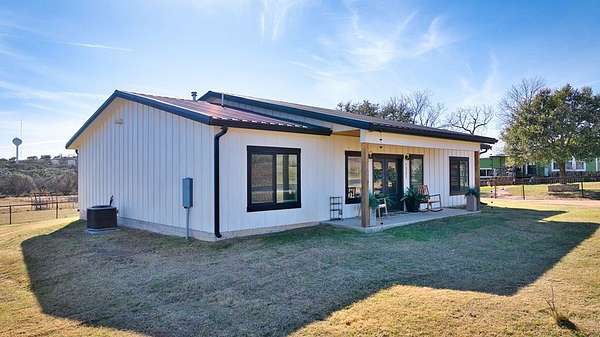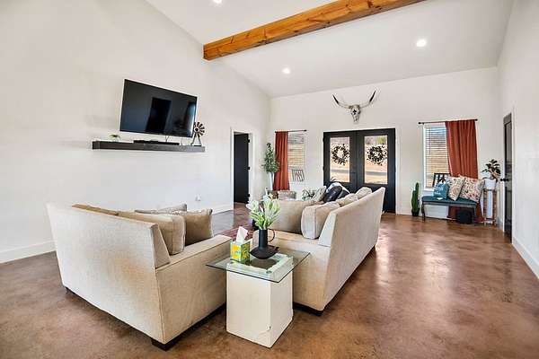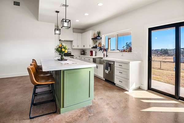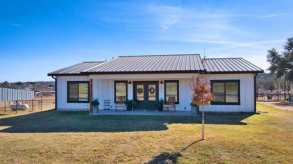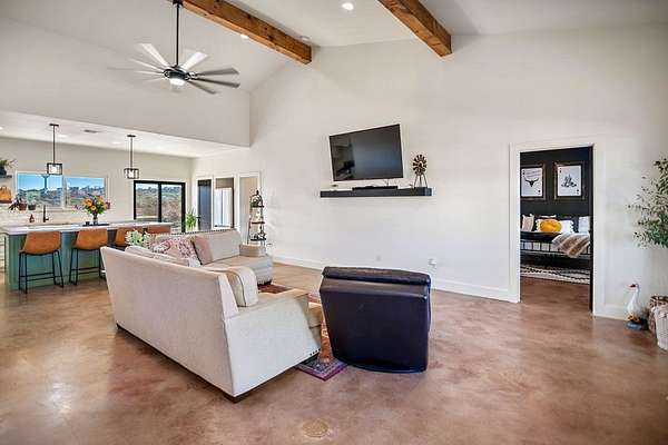 Positioned on nearly two acres just inside the Mason city limits along Koocksville Road, this thoughtfully crafted three-bedroom, two-bath residence offers a refined take on modern Hill Country living with room to breathe. Clean architectural lines, a metal roof, and a welcoming covered front porch set the tone, creating an inviting first impression that feels both timeless and intentional. Inside, the home opens to a light-filled living space defined by vaulted ceilings, polished concrete floors, and an open flow designed for everyday comfort and effortless entertaining. The living area transitions seamlessly into a well-appointed kitchen featuring crisp white cabinetry, a contrasting center island with seating, custom concrete countertops, stainless appliances, and statement pendant lighting. Large windows and glass doors frame views of the surrounding acreage, bringing the outdoors in and anchoring the home in its setting. The primary suite offers a quiet retreat with a calming palette and a spa-inspired ensuite bath complete with a dual vanity, modern fixtures, and a beautifully tiled walk-in shower. Secondary bedrooms are generously sized and thoughtfully finished, while the shared bath continues the home's cohesive design with quality materials and clean, contemporary styling. A dedicated laundry and mudroom adds everyday functionality with custom storage, custom stained wood countertops, durable finishes, and direct outdoor access--ideal for country living without sacrificing organization or ease. Outside, the property is equally compelling. A well-maintained lawn surrounds the home, while the fully fenced acreage behind it offers flexibility for show animals, hobby livestock, or future equestrian improvements. Paved road access, a covered parking area, and proximity to Mason's award-winning schools and conveniences make this property both practical and highly desirable. Well cared for and beautifully executed, this home offers a rare combination of modern design, usable acreage, and in-town convenience--an exceptional opportunity just minutes from the heart of Mason.