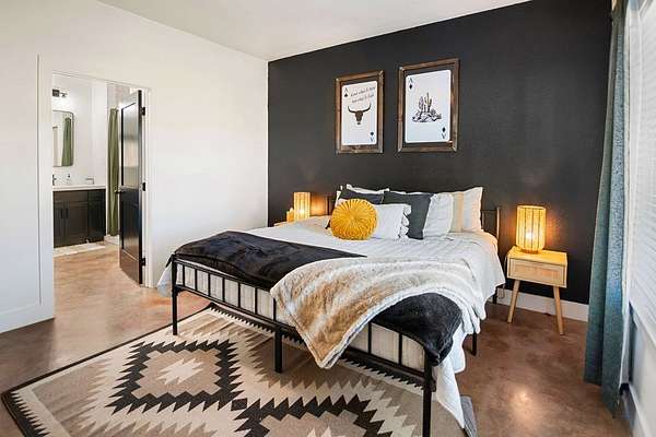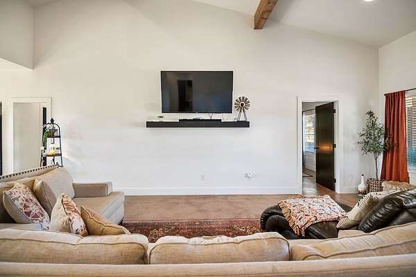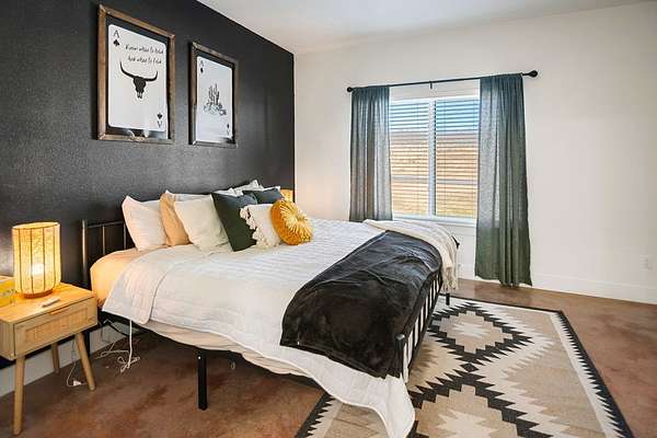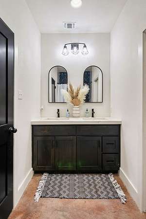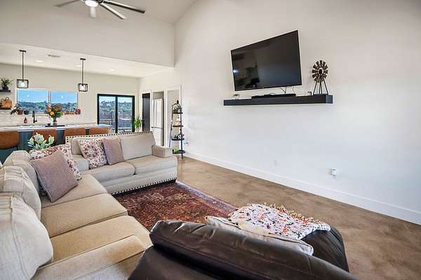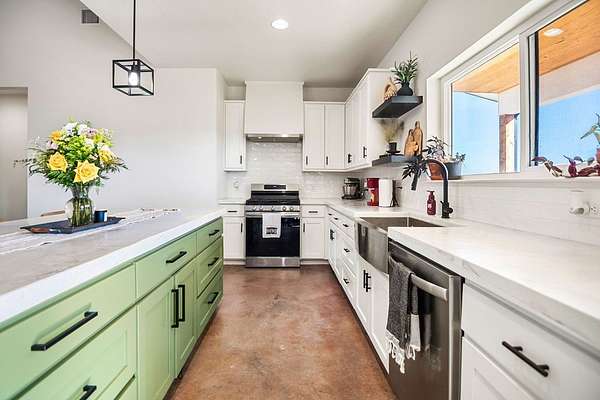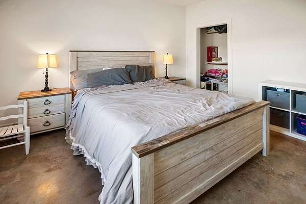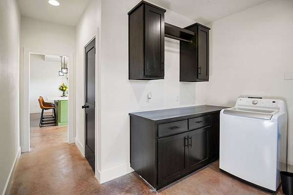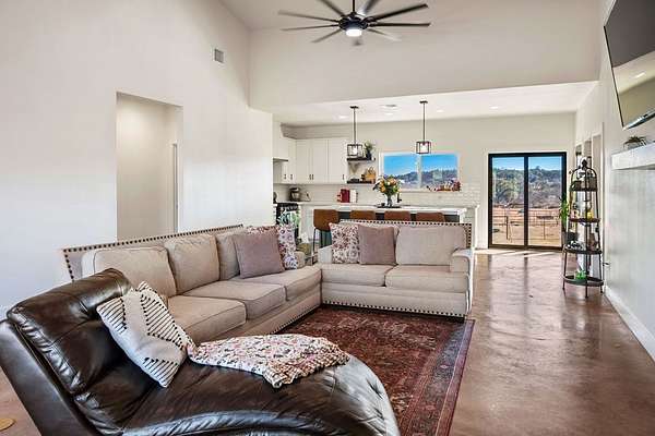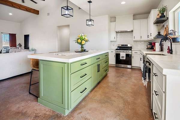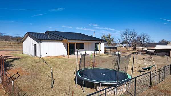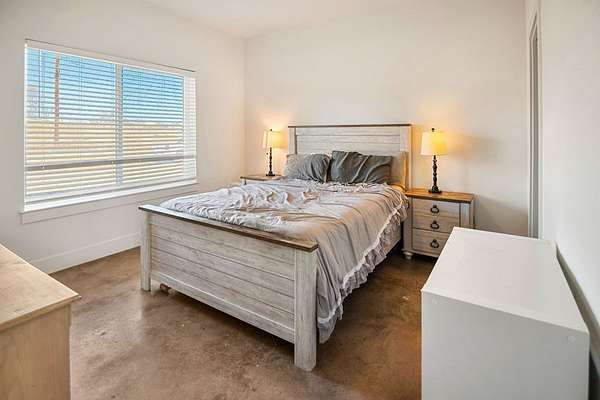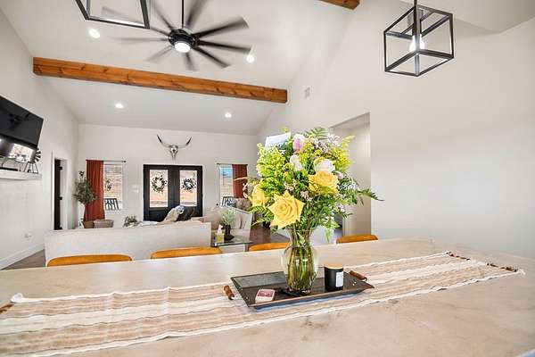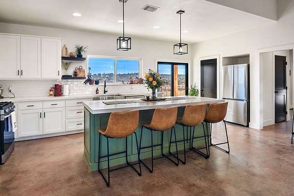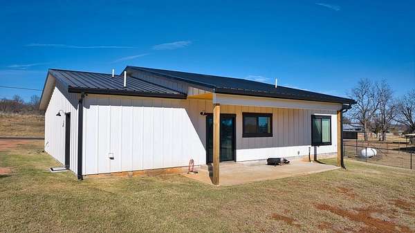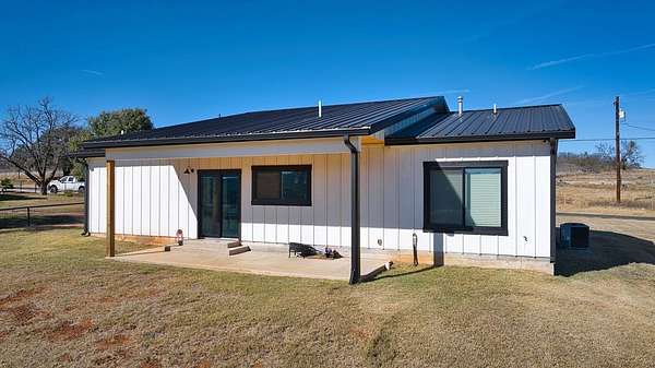 Positioned on nearly two acres just inside the Mason city limits along Koocksville Road, this thoughtfully crafted three-bedroom, two-bath residence offers a refined take on modern Hill Country living with room to breathe. Clean architectural lines, a metal roof, and a welcoming covered front porch set the tone, creating an inviting first impression that feels both timeless and intentional. Inside, the home opens to a light-filled living space defined by vaulted ceilings, polished concrete floors, and an open flow designed for everyday comfort and effortless entertaining. The living area transitions seamlessly into a well-appointed kitchen featuring crisp white cabinetry, a contrasting center island with seating, custom concrete countertops, stainless appliances, and statement pendant lighting. Large windows and glass doors frame views of the surrounding acreage, bringing the outdoors in and anchoring the home in its setting. The primary suite offers a quiet retreat with a calming palette and a spa-inspired ensuite bath complete with a dual vanity, modern fixtures, and a beautifully tiled walk-in shower. Secondary bedrooms are generously sized and thoughtfully finished, while the shared bath continues the home's cohesive design with quality materials and clean, contemporary styling. A dedicated laundry and mudroom adds everyday functionality with custom storage, custom stained wood countertops, durable finishes, and direct outdoor access--ideal for country living without sacrificing organization or ease. Outside, the property is equally compelling. A well-maintained lawn surrounds the home, while the fully fenced acreage behind it offers flexibility for show animals, hobby livestock, or future equestrian improvements. Paved road access, a covered parking area, and proximity to Mason's award-winning schools and conveniences make this property both practical and highly desirable. Well cared for and beautifully executed, this home offers a rare combination of modern design, usable acreage, and in-town convenience--an exceptional opportunity just minutes from the heart of Mason.
