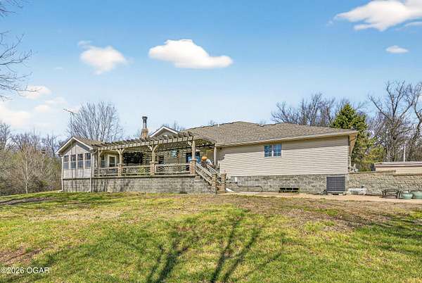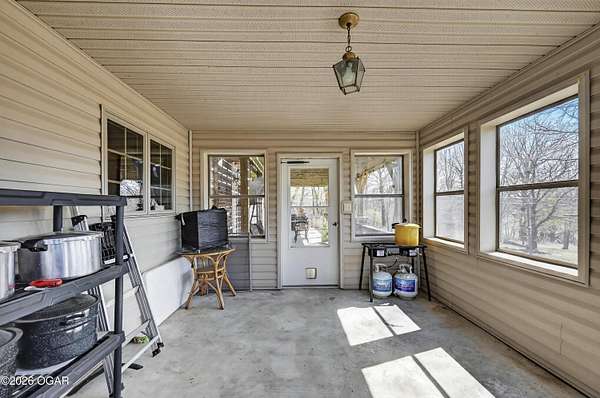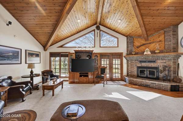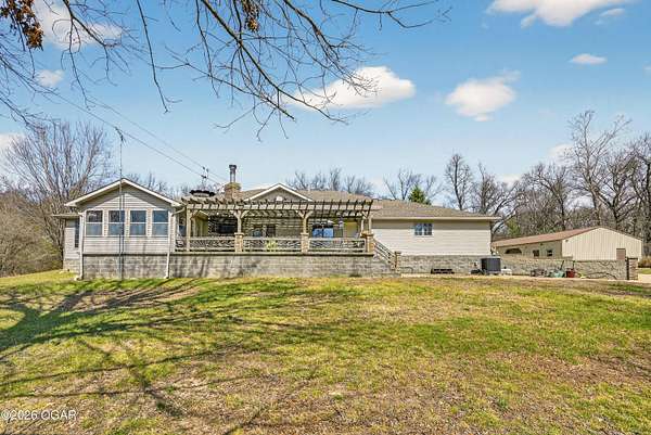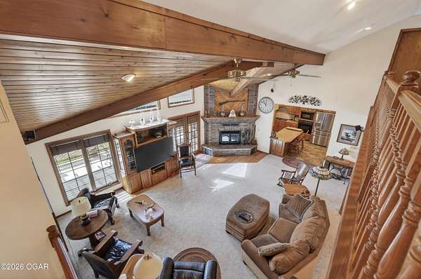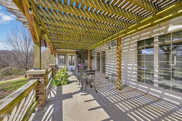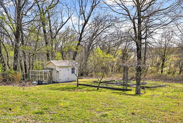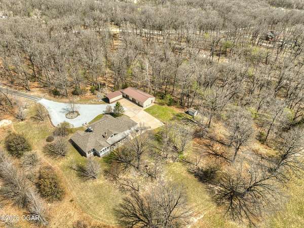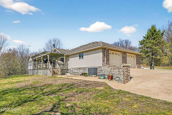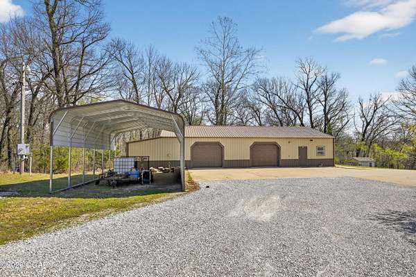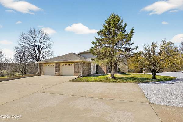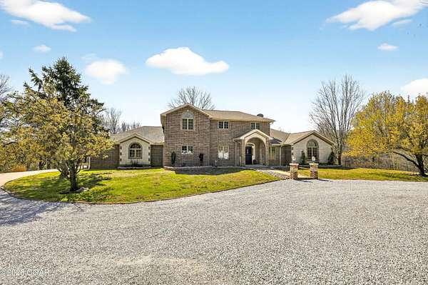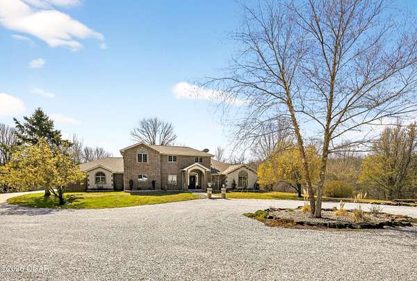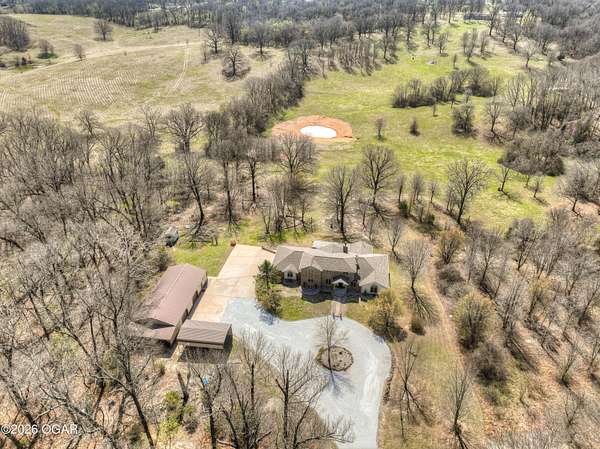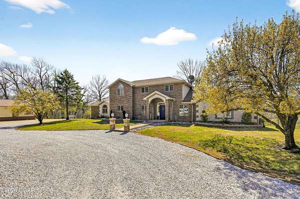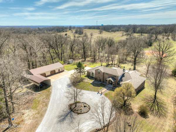 Grand, stunning, and truly stately--this impressive 3,117 sq ft, 3 bedroom, 2.5 bath CUSTOM home sits on 12.1 beautiful acres in Newton County and delivers the perfect blend of privacy, space, and timeless appeal. An impressive gated, paved drive winds through the trees, creating a peaceful, private approach before opening up to reveal this striking two-story home with brick and stone exterior. The electric gate adds both security and a grand first impression. Step inside the welcoming foyer and into a spacious great room featuring a wood-burning fireplace and a stunning paneled wood vaulted ceiling--an eye-catching detail that adds warmth and character. The flexible layout is perfect for entertaining or creating multiple cozy sitting areas. The kitchen is ideally positioned just off the great room-- Seller enjoys the surplus of cabinets. She says, '' It is easy to cook, talk, and entertain, but set back enough so cooking and cleaning is out of view.'' A formal dining room with built-in display cabinetry adds charm and function for gatherings and special occasions. The primary suite offers a true retreat with two walk-in closets, a spacious ensuite bath with walk-in shower and jetted soaking tub. A bonus room--currently used as a craft room--offers versatility as a potential fourth bedroom, second office, or hobby space. A large front-facing office provides a view of front yard and a quiet place to work or study. The oversized laundry room includes a sink, storage, and plenty of workspace. Upstairs, you'll find two spacious bedrooms, a large hall bath, and convenient attic access for additional storage. The basement provides excellent space for organized storage--perfect for canned goods, seasonal decor, and more--and includes an indoor storm shelter for added peace of mind. Off the great room, a large patio with both pergola and a sunroom enclosure creates a dynamic layered outdoor living space. Outside, the property continues to impress with an oversized two-car attached garage, plus a 30 x 60 freestanding shop with two overhead doors and room for 4 vehicles or more! A chicken coop for true country living is Missouri style bonus! Enjoy abundant wildlife and serene views from your back porch, making every day feel like a retreat. As the seller shares, ''I love the long wooded driveway--it feels peaceful and private; the view from the back porch is abundant with wildlife and nature.'' Cozy, warm, and welcoming, this is the kind of property that doesn't come along often--space, beauty, and functionality all in one remarkable setting.