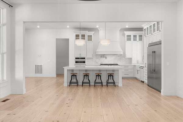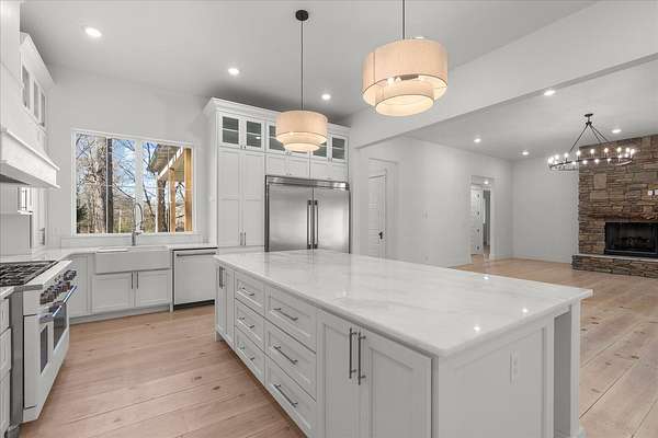 The main level features a stunning primary suite with his-and-hers closets and a 14-foot walk-in shower. At the heart of the home, the chef's kitchen showcases custom cabinetry, Cafe commercial-style appliances, 48-inch gas range, butler's pantry, wine storage, and a keeping room perfect for everyday gathering. A formal dining room and dedicated office add both elegance and function. Upstairs offers two spacious bedrooms, each with en suite baths, plus a game room with custom built-in shelving.