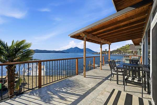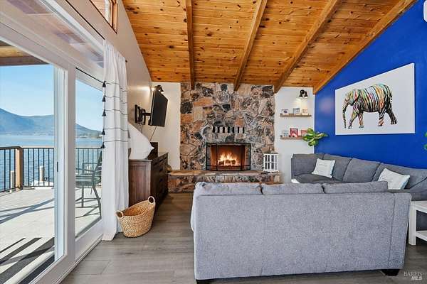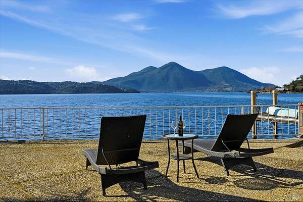Peaceful Lakefront Retreat with the best panoramic views of beautiful Clearlake and Mt. Konocti. Situated in Oak Cove, this two-story private residence offers versatility as an income generating vacation rental or occupy for your own personal use (or both). Each level provides an individual living space with it's own private entrance and has been updated on both levels with custom finishes including stone fireplaces, LVP flooring, tiled bathrooms, cabinetry and lighting! The second level was previously operated as a short-term rental and offers open concept living with 3 bedrooms/1 full bath, a galley style kitchen, laundry room, and living room with attached deck to soak in the spectacular views. The main level is currently used as a primary residence and includes 2 bedrooms/1 bathroom, an extra storage room, and open concept kitchen/living room design. There is plenty of room to entertain on the oversized patio out front and enjoy fishing and/or swimming off your private pier with attached floating dock. The low-maintenance patio also includes a fire pit area and included spa for ultimate relaxation. Situated on over 60' of lakefront seawall, including a rock jetty, this property adjoins a protected marina next door for additional temporary parking for boats and/or other small vessels. Located less than 10 min from nearest boat launch and other amenities, this property is the epitome of lake living at it's finest.