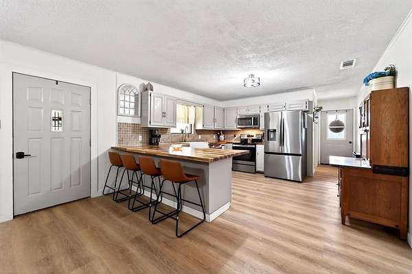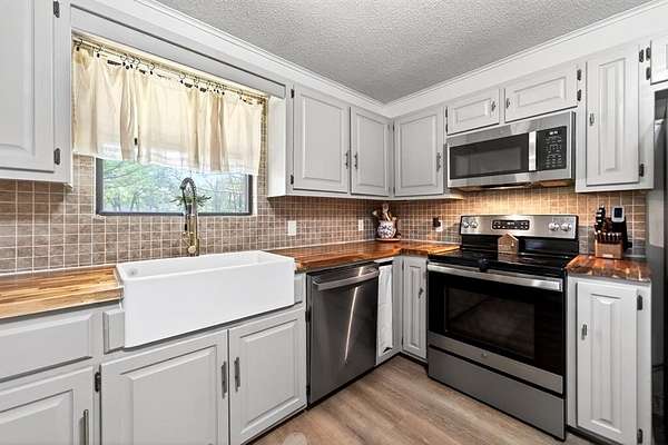 Step inside to find fresh paint and beautiful LVP flooring throughout, creating a warm and inviting feel. The thoughtfully updated kitchen features butcher block countertops, a farm sink perfectly placed under a window, and modern appliances including a stove and dishwasher--ideal for both everyday living and entertaining.