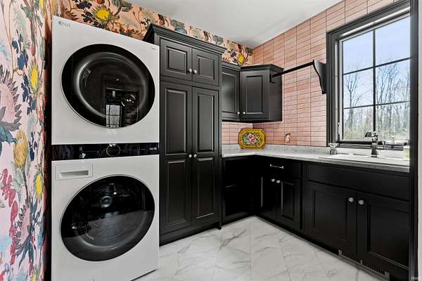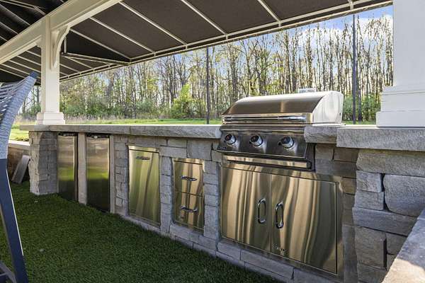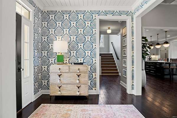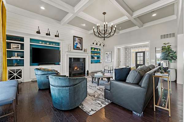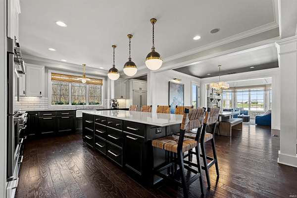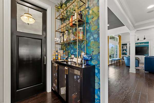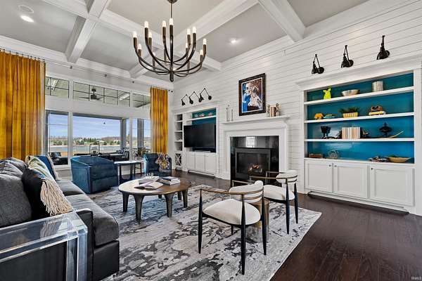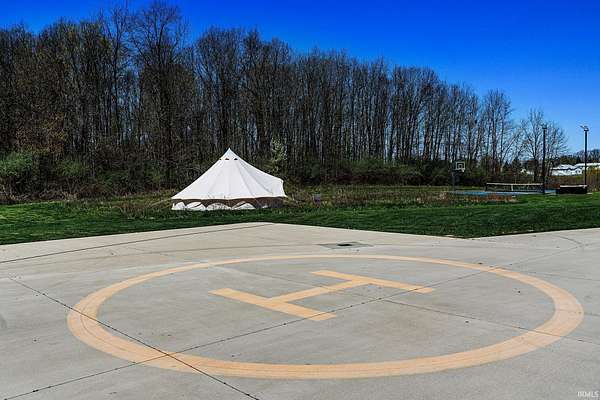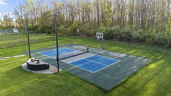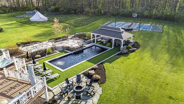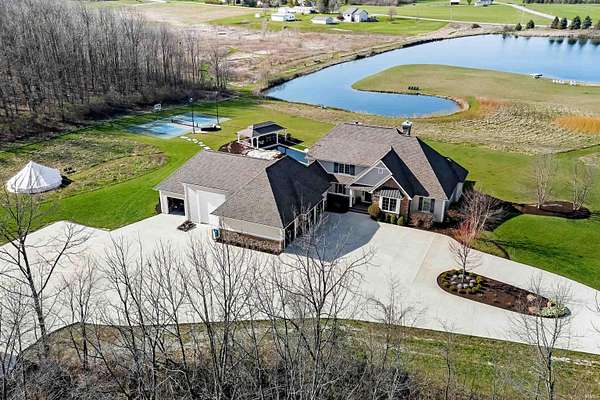 A rare opportunity to own a private 16-acre estate just minutes from Fort Wayne's north side featuring a custom-built 6-bedroom home, 5-acre stocked pond, heated in-ground pool, and 5-car heated garage. Located in Northwest Allen County Schools, with optional adjacent parcels expanding the property to over 33 acres. Designed by Frank Souder Interiors, this home blends timeless elegance with modern amenities. The main level offers coffered ceilings, gas fireplace, custom built-ins, and a chef's kitchen with quartz countertops, high-end appliances, and a walk-in pantry. A hearth room with wood-burning fireplace and the primary suite both overlook the resort-style grounds. The main-floor office and three laundry stations add daily convenience. The finished walk-out lower level includes 3 bedrooms, 2 baths, a wet bar, and flexible living spaces. The covered deck features motorized screens, built-in heaters, grilling area, and hot tub space ideal for year-round entertaining. Stone paths lead to the heated pool and pavilion. Outbuildings include a 60x45 heated hangar with epoxy floors and 36' hydraulic door, plus a 40x35 building - offering room for 15-20+ vehicles. Additional features: pickleball/basketball court, fire pit, chicken coop, irrigation system, and whole-home generator!