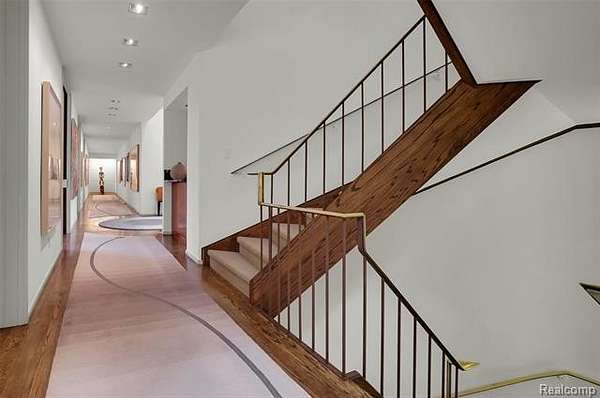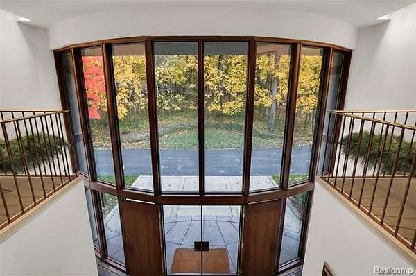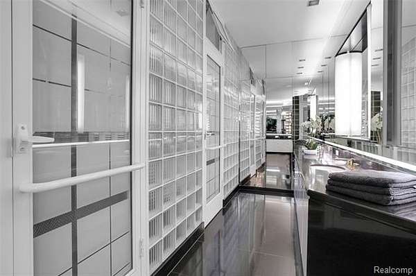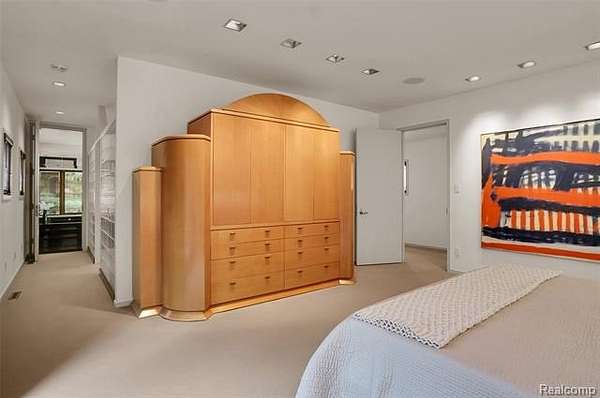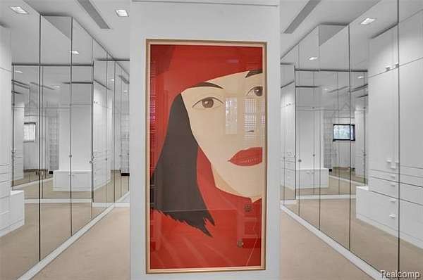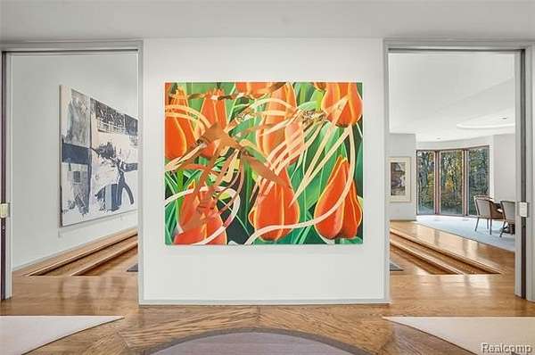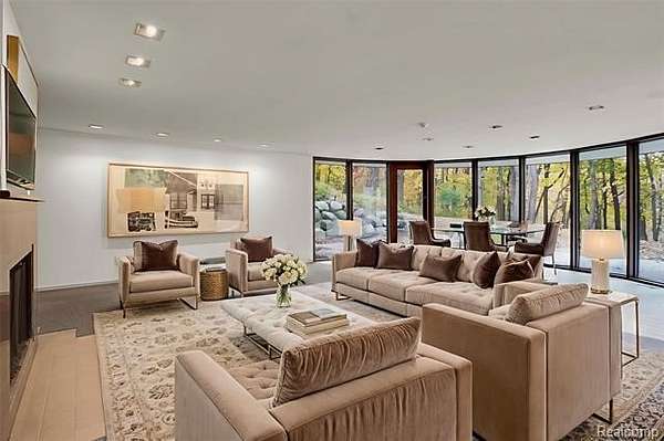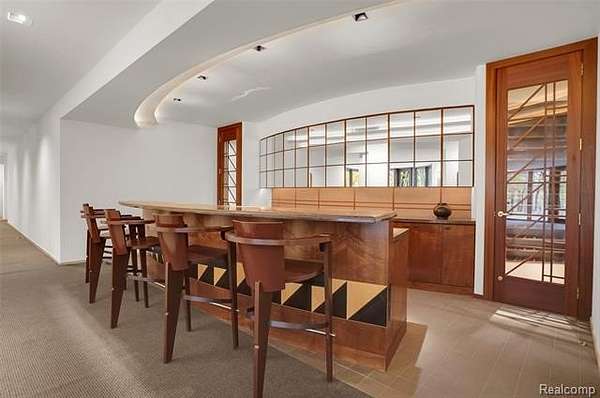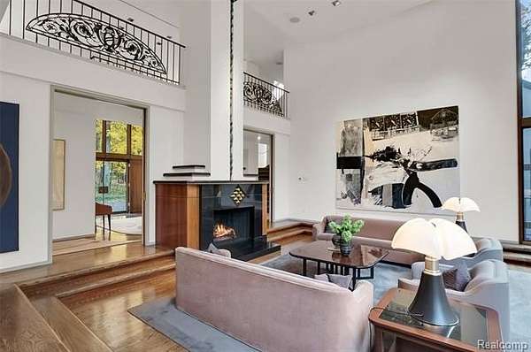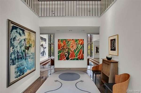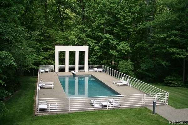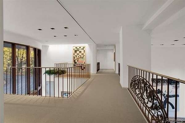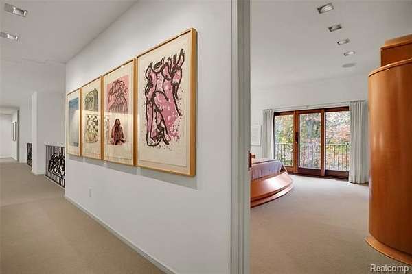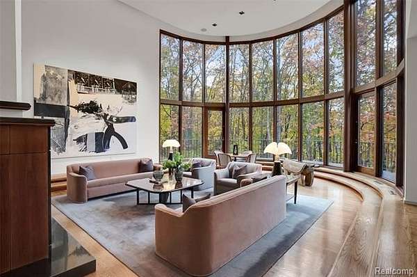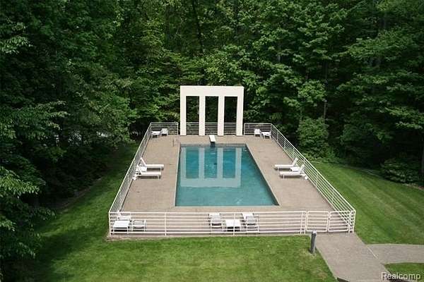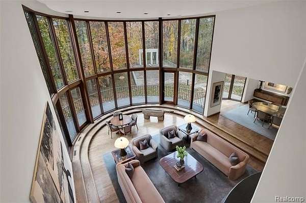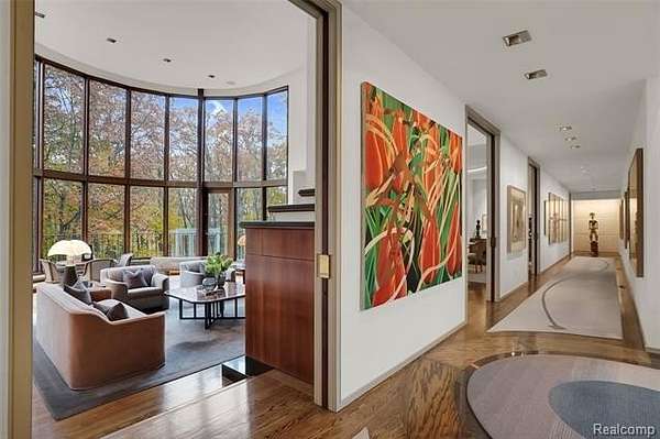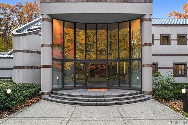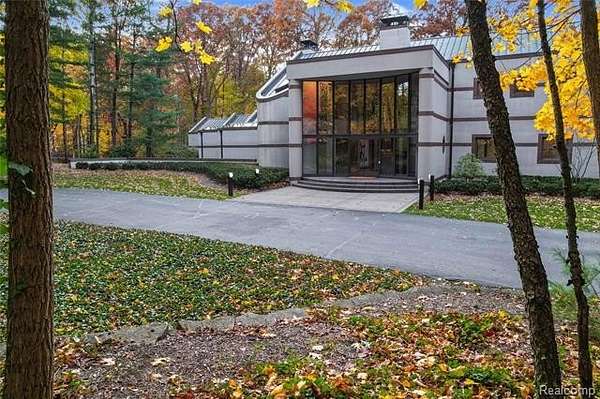 A secluded 3.3 acre wooded setting in Bloomfield Hills unfolds to reveal an incomparable Post Modern masterpiece. Designed by architect Sigmund Blum, the home boasts over 10,000 square feet of sophisticated and inviting living space and creates a unique and exciting relationship between architecture and landscape. With meticulous attention to textures and detail, use of durable materials and luxe wood finishes blend to create a truly livable residence. Lighting plays an integral role in the home's design. A dramatic two-story foyer opens to soaring gallery-like spaces complemented by oak and mahogany finishes, cove lighting, and floor-to-ceiling windows. Custom lighting and millwork, curated materials, and timeless craftsmanship define each room of the home. The expansive living and dining room spaces provide spectacular views of the rear grounds through a curved wall of floor-to-ceiling windows. The gourmet, island kitchen features Dakota mahogany granite, Pewabic tile, and tremendous storage and leads to the back hall mud area and 4-car garage. The entry level is also highlighted by an entertainer's bar, fireplaced library, and a skylit corridor leading to three secondary bedrooms. A second library coupled with the serene Primary Suite creates an owners' private retreat on the upper level of the home. The Primary is adorned with a sophisticated, Andes granite bath and an oversized walk-in dressing room with floor-to-ceiling wardrobe storage. A three-room professional office suite is accessible off the upper level corridor or by a private exterior stairway and entry. The finished walk-out lower level, with 9 ft ceilings, provides additional entertainment and recreation space: family room with fireplace, bar with wine display, 5th bedroom suite, mirrored fitness room, changing room and bath. Outdoor amenities include a pool highlighted by an impressive sculpture, hot tub, clay tennis court with spectator seating. This incredible home is truly one-of-a-kind!