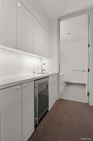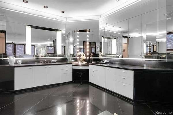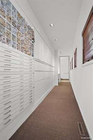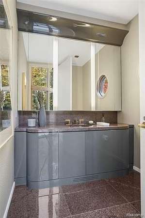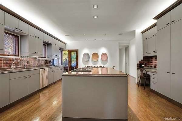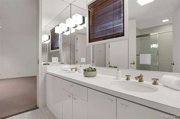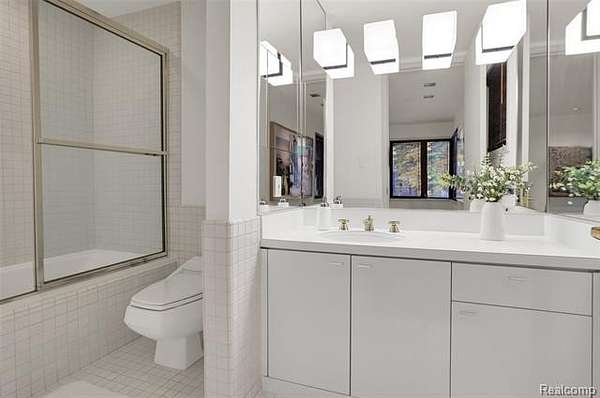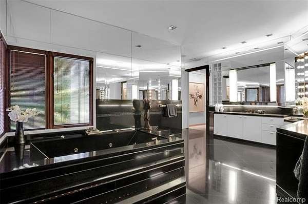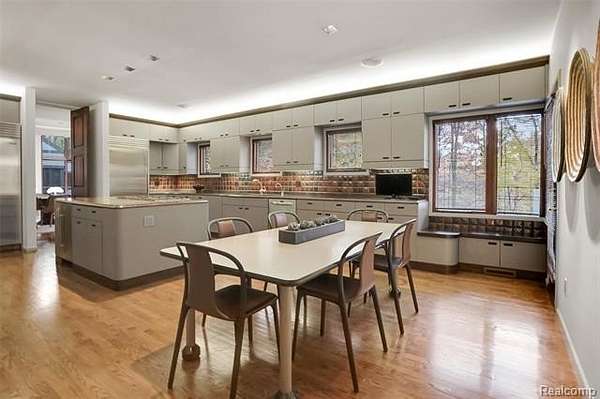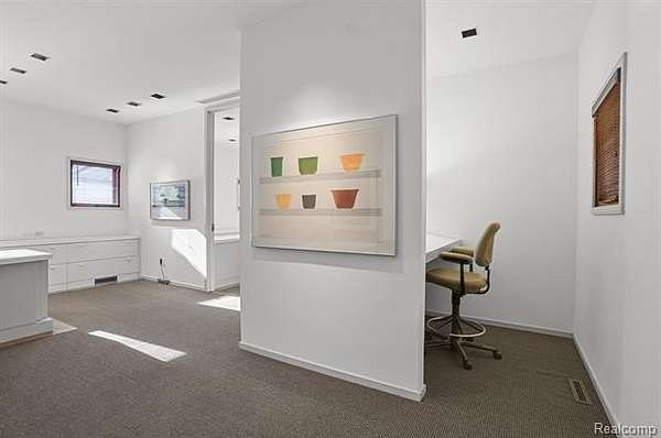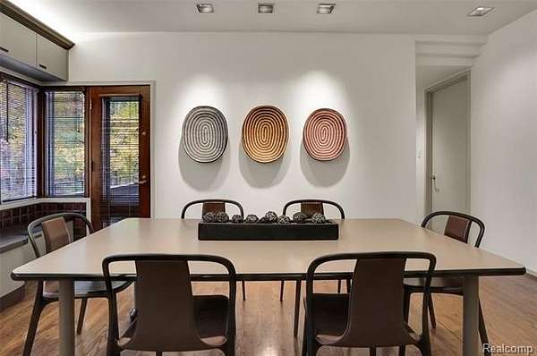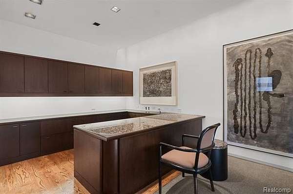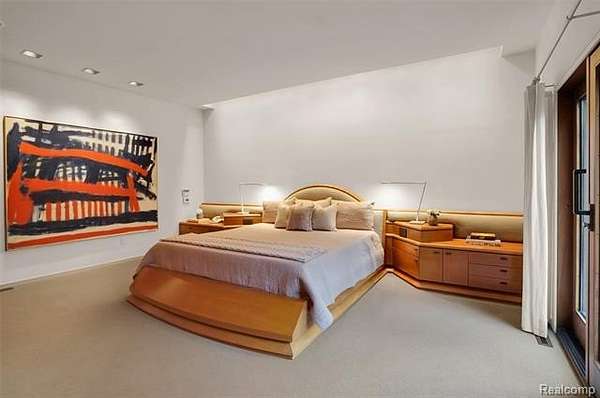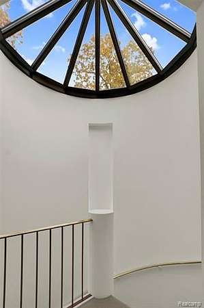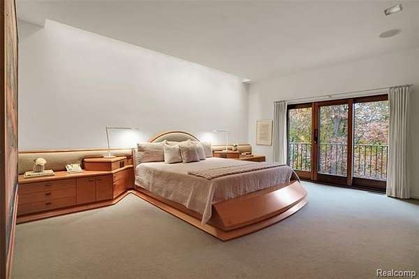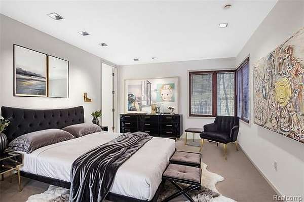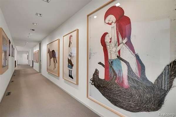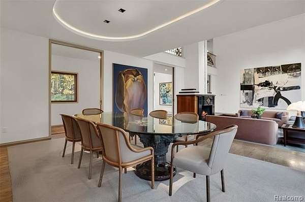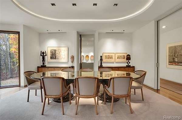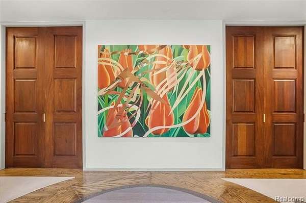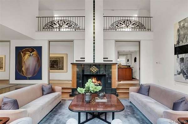 A secluded 3.3 acre wooded setting in Bloomfield Hills unfolds to reveal an incomparable Post Modern masterpiece. Designed by architect Sigmund Blum, the home boasts over 10,000 square feet of sophisticated and inviting living space and creates a unique and exciting relationship between architecture and landscape. With meticulous attention to textures and detail, use of durable materials and luxe wood finishes blend to create a truly livable residence. Lighting plays an integral role in the home's design. A dramatic two-story foyer opens to soaring gallery-like spaces complemented by oak and mahogany finishes, cove lighting, and floor-to-ceiling windows. Custom lighting and millwork, curated materials, and timeless craftsmanship define each room of the home. The expansive living and dining room spaces provide spectacular views of the rear grounds through a curved wall of floor-to-ceiling windows. The gourmet, island kitchen features Dakota mahogany granite, Pewabic tile, and tremendous storage and leads to the back hall mud area and 4-car garage. The entry level is also highlighted by an entertainer's bar, fireplaced library, and a skylit corridor leading to three secondary bedrooms. A second library coupled with the serene Primary Suite creates an owners' private retreat on the upper level of the home. The Primary is adorned with a sophisticated, Andes granite bath and an oversized walk-in dressing room with floor-to-ceiling wardrobe storage. A three-room professional office suite is accessible off the upper level corridor or by a private exterior stairway and entry. The finished walk-out lower level, with 9 ft ceilings, provides additional entertainment and recreation space: family room with fireplace, bar with wine display, 5th bedroom suite, mirrored fitness room, changing room and bath. Outdoor amenities include a pool highlighted by an impressive sculpture, hot tub, clay tennis court with spectator seating. This incredible home is truly one-of-a-kind!