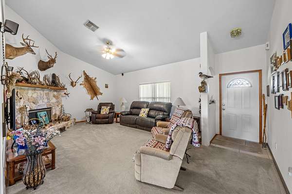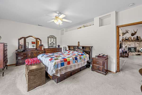 - Built-In Shelves, Fireplace(s), Kitchen Island, Split Bedroom, Walk-In Closet