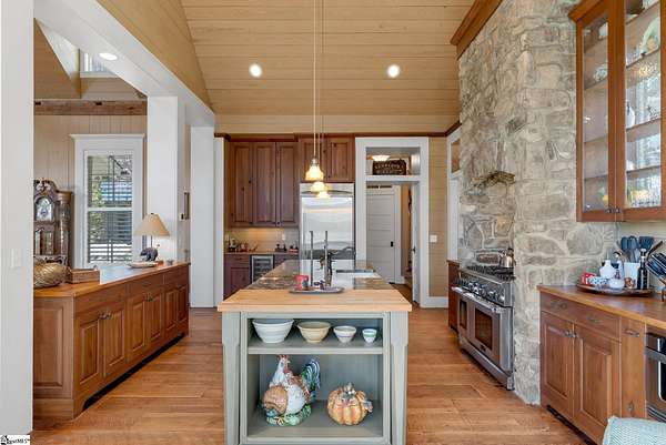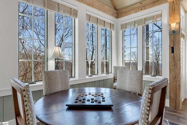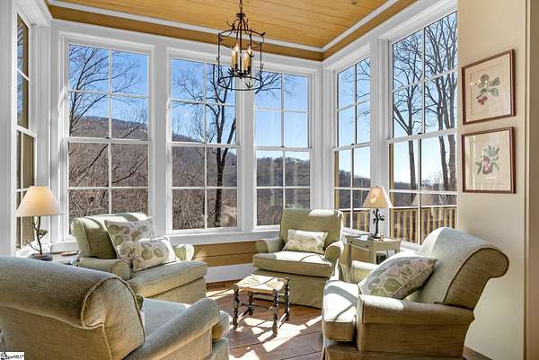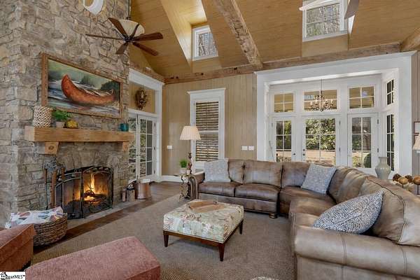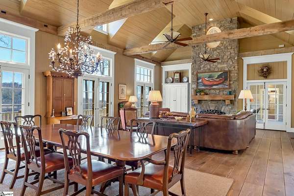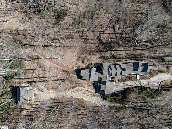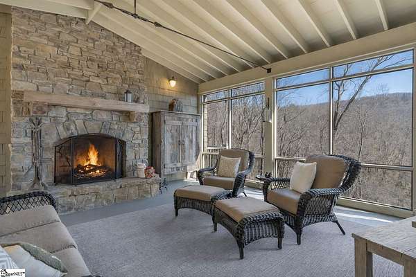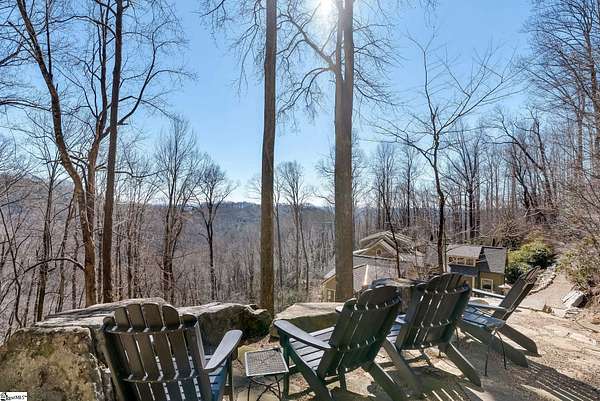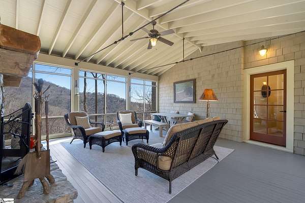 Perched at approximately 2,000 feet in elevation, this exceptional mountain retreat captures sweeping mountain vista views and the tranquil soundtrack of Gap Creek, highlighted by a striking 30-foot natural waterfall along the property. Encompassing 3.9 private acres and bordering 79 protected acres, the setting offers remarkable privacy, combined with preserved natural beauty. Upon entry, the residence unfolds with warmth and architectural intention. Eleven foot heart-of-pine floors sourced from the late 1800's, and reclaimed maple countertops dating to the 1890's create a sense of heritage and authenticity throughout. Natural light filters through thoughtfully placed windows and French doors, drawing the outdoors in and enhancing the home's inviting ambiance. Unique architectural details--including charming porthole accents, a hidden door for storage seamlessly integrated into the mudroom, custom built-ins, and breeze doors with screened transoms--offer both character and function. The interiors feel curated yet comfortable, blending mountain craftsmanship with timeless design. Designed by Historical Concepts, renowned for their skill in combining traditional with vernacular architecture, and built in 2008 by Bluestone Construction, the home reflects architectural integrity and enduring quality. The kitchen balances beauty and performance with Thermador appliances, including a six-burner gas range, complemented by a farm sink, secondary hand sink, and a glass pass-through cabinet window. A built-in desk positioned between the kitchen and primary suite creates an ideal office nook. Living and entertaining spaces transition seamlessly outdoors to a screened porch featuring an outdoor stone fireplace with iron tie ceiling accents. Three sets of French doors open to the extended rear deck, rebuilt with TREX decking, welcoming mountain breezes and layered views. Outdoor living areas are perfectly positioned to capture the soothing, rhythmic sounds of the nearby waterfall, creating a peaceful backdrop for relaxing mornings and serene mountain evenings. A private guest wing offers its own entrance, creating a comfortable and secluded retreat for visitors. This wing features generously sized guest suites with board and batten walls and thoughtfully curated finishes, blending character with privacy while remaining connected to the main home. A newly constructed stone bridge provides a classic and welcoming private entrance to the guest wing. Separate from the main residence, a charming guest house provides additional flexibility for extended stays, an art studio, office, or workout space. Accessible by a stone walkway, as well as a dedicated golf cart path, the guest house enhances the estate's versatility and sense of retreat. Its private patio captures truly spectacular mountain views, offering a stunning vantage point to relax, entertain, and take in the natural beauty that surrounds the property. Significant recent updates ensure turnkey confidence. The roof on both the main home and guest house was replaced in 2026. HVAC systems were updated in 2023, and a new driveway was installed in 2025. Gutters were added and the stone grilling patio was redone in 2024. The exteriors of both the home and guest house were repainted in 2025, and the screened porch was recently refreshed. The sellers will be passing along most of the furnishings to make this truly a home to enjoy right away. This is a rare convergence of architectural pedigree, thoughtful updates, natural preservation, and elevated mountain living--crafted for those who value privacy, authenticity, and enduring design. A membership to the Cliffs seven private communities is available for purchase.