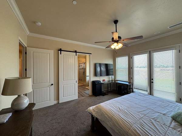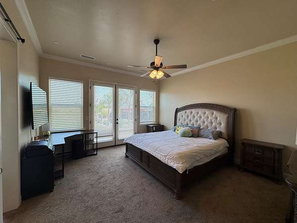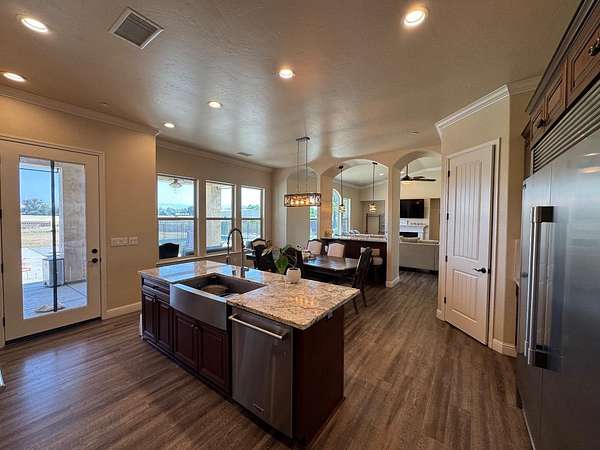 This Mediterranean-inspired custom home, built in 2020, is a seamless blend of sophistication and practicality. Spanning over 2 acres, the property includes a total of 5 bedrooms, 4 bathrooms, and 4 garage spaces. Wrapped into all of this is a separate ADU featuring its own private entry, living area, bedroom, bathroom, full kitchen, dining nook, washer/dryer hookups, garage and storage space. As you enter through the custom iron front door, you're welcomed by soaring vaulted ceilings and panoramic views of the pool and the Sierra Nevada Mountains. The chef's kitchen is a showstopper, boasting a 13-foot ceiling, granite countertops, a striking subway-tile marble backsplash that reaches the ceiling, a walk-in pantry, and top-tier appliances like the 48 Thor double oven/range with 6 burner cooktop griddle, plus a 66 side-by-side fridge and freezer. The primary suite offers a luxurious retreat with an oversized walk-in closet, freestanding tub, and a tiled double shower. Down the hall, three additional bedrooms offer generous closet space and comfort. The oversized 3-car garage is finished with insulated roll-up doors, and the property also features secure RV and boat parking, making it the ideal home for those who love outdoor adventures. Call now to schedule your showing experience.
