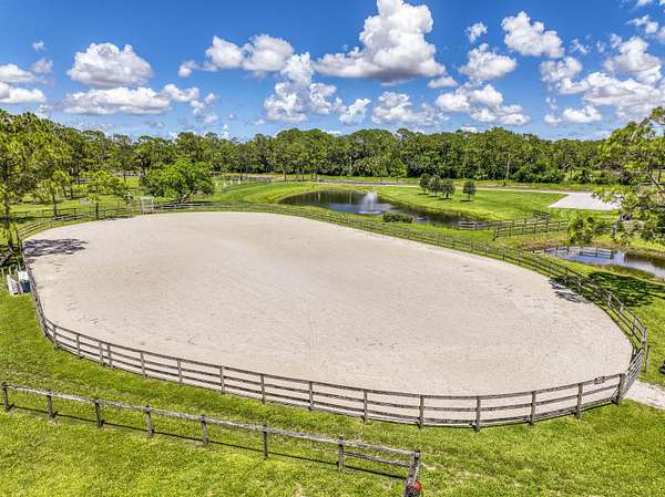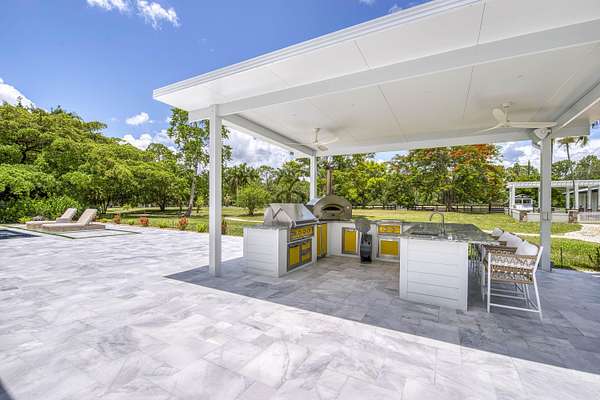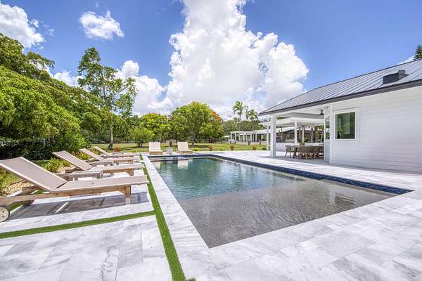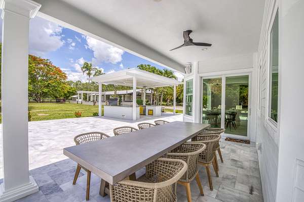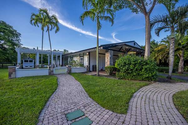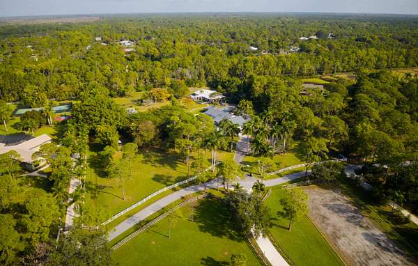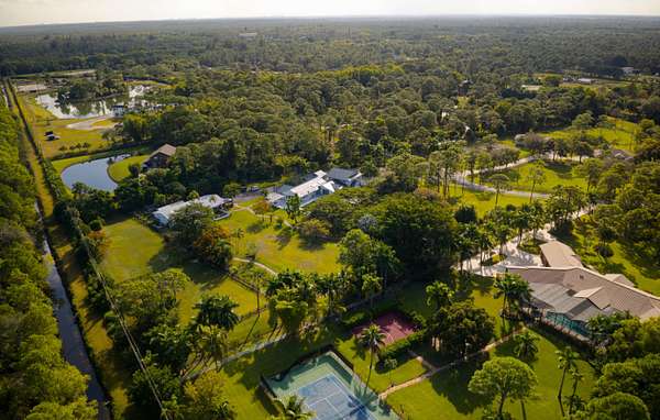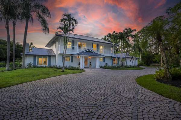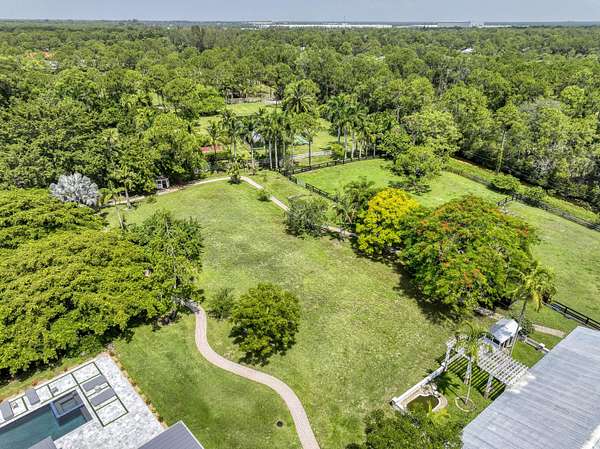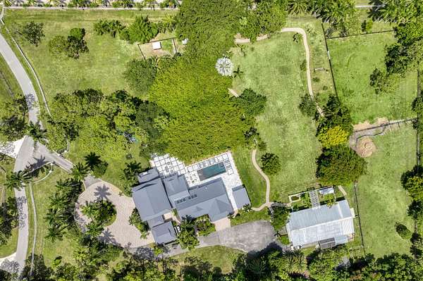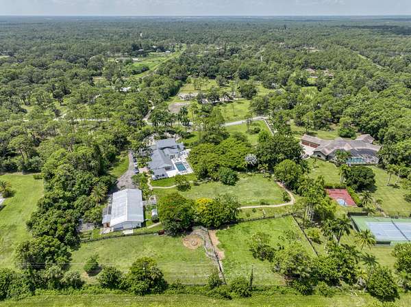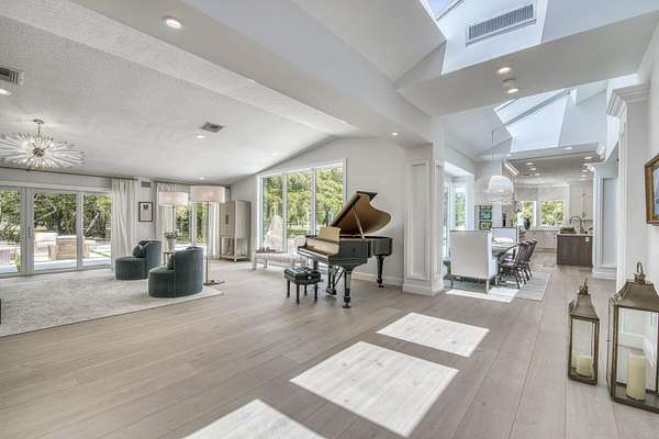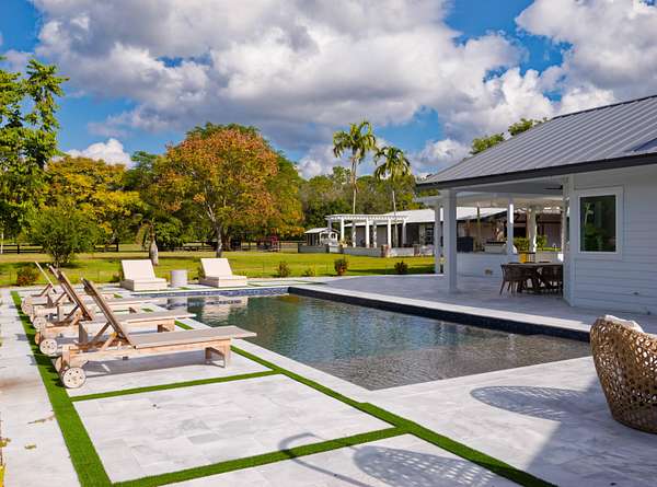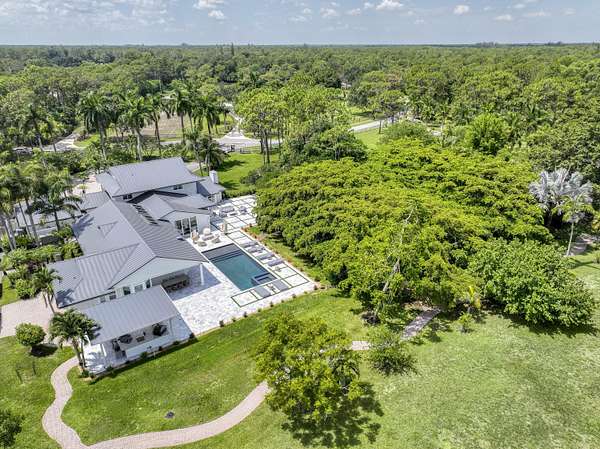 Escape to your private South Florida sanctuary, a modern French Country estate that redefines refined living on over five acres of lush, equestrian land. Here, tranquility, craftsmanship, and contemporary luxury coexist in perfect balance. Every inch of this estate has been thoughtfully redesigned, blending timeless European charm with the ease of contemporary luxury living. From the moment you arrive along the long private drive, the home reveals its elegance through vaulted, skylit ceilings, walls of glass, and wide-plank European oak flooring that flood each space with natural light. The heart of the home is the show-stopping chef's kitchen, anchored by dual oversized islands, quartz countertops, and ceiling-height custom cabinetry. A statement wood hood crowns the professional