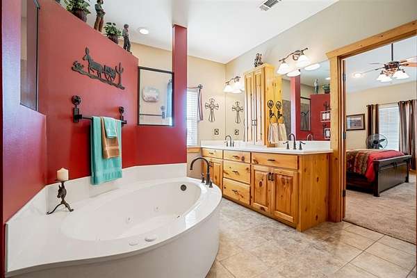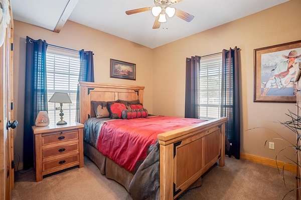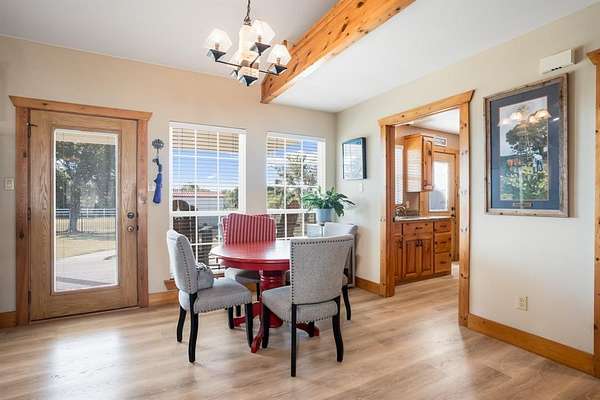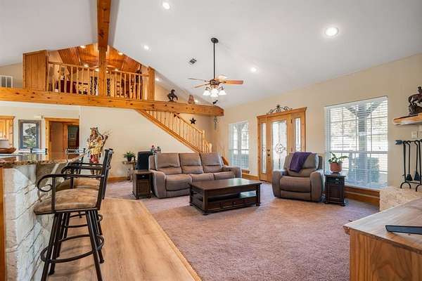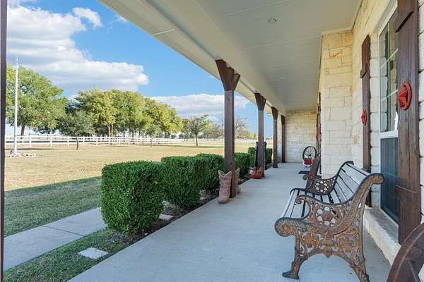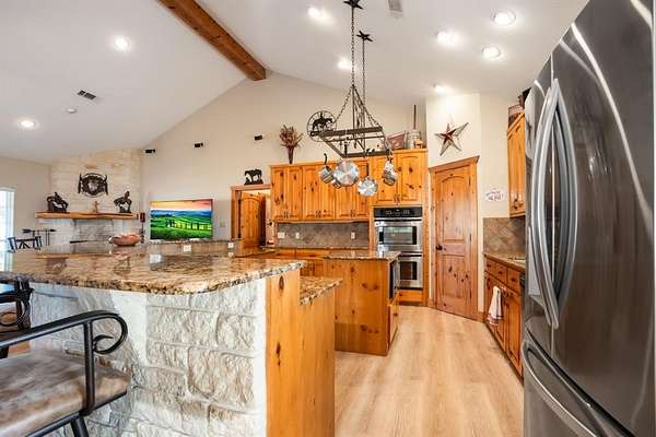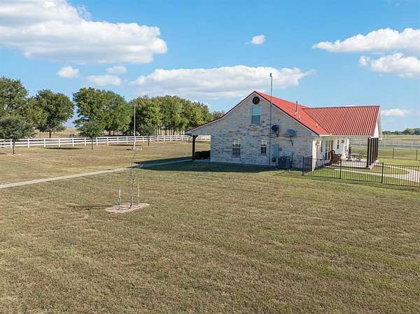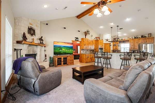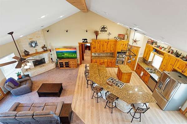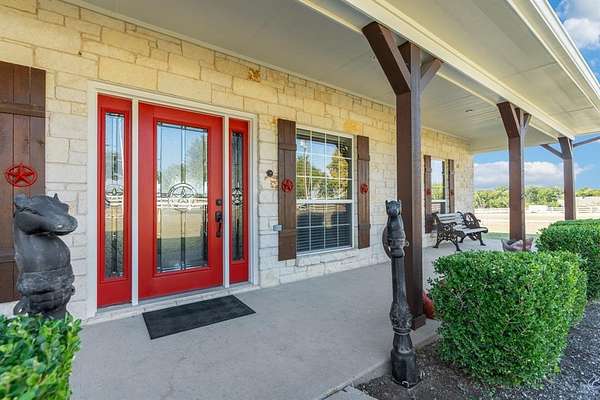 IMMACULATE 3-bedroom, 2-bathroom peaceful rural retreat offering 1,944 square feet of comfortable living space on 3.37 acres with the added benefit of a 400 square feet mother-in-law suite! Experience the comforts of home with rustic warm details surrounded by rural, landscaped setting with quick access to I-35. The heart of the home features a wood burning fireplace and a stunning eat-in kitchen complete with elegant granite countertops and a functional kitchen island perfect for meal prep and casual dining. Character and warmth fill every room, while soaring vaulted ceilings create an open and airy atmosphere. Primary suite includes a generous walk-in closet with built-in ironing board, oversized tile shower with dual heads, and a large jetted tub for relaxing. Step outside to the covered rear porch, an ideal spot for morning coffee, evening relaxation, or entertaining guests while enjoying serene country views. 30x40 shop with concrete floor, roll up door, and 20x40 attached awning provides ample storage. The shop also features a built-in versatile mother-in-law suite that is flexible for multi-generational living, guest accommodations, or could serve as a home office or hobby space. This addition is ideal for families seeking room to grow or those who want space for visiting relatives. The property's perimeter is fully fenced, and additionally iron backyard fencing keeps your human and furry loved ones close! This home is move in ready!
