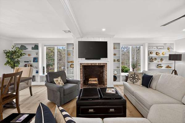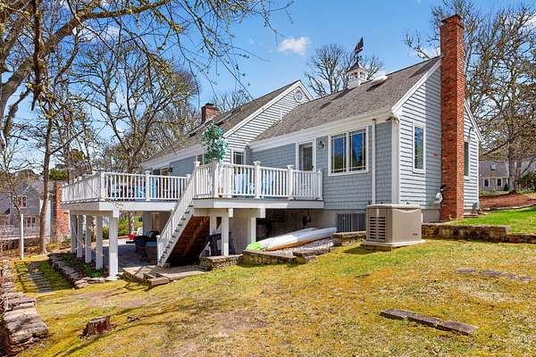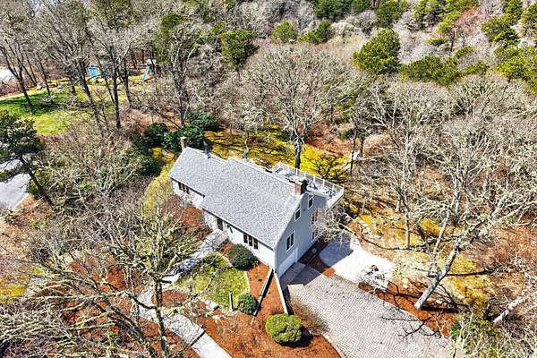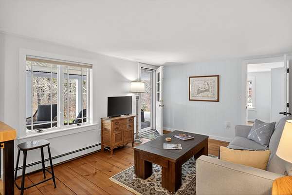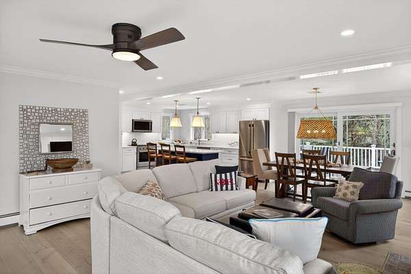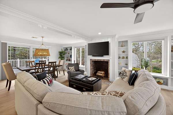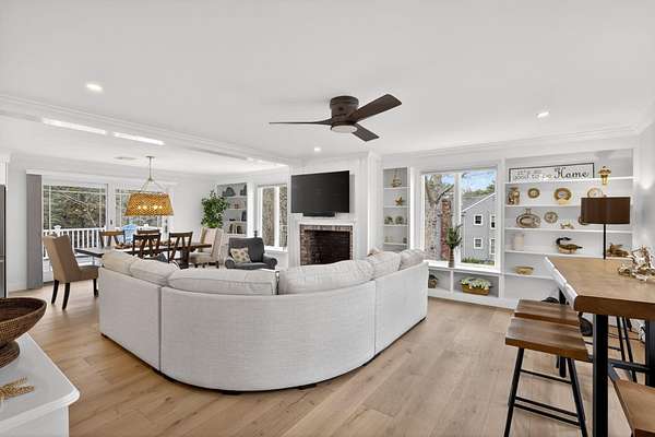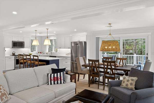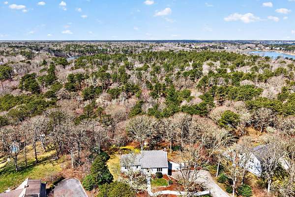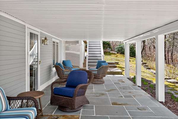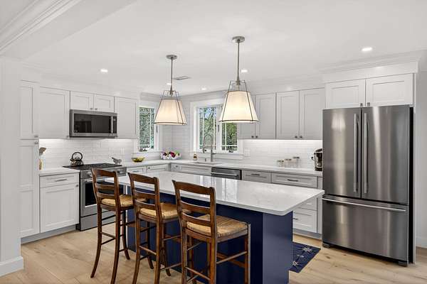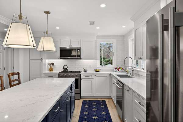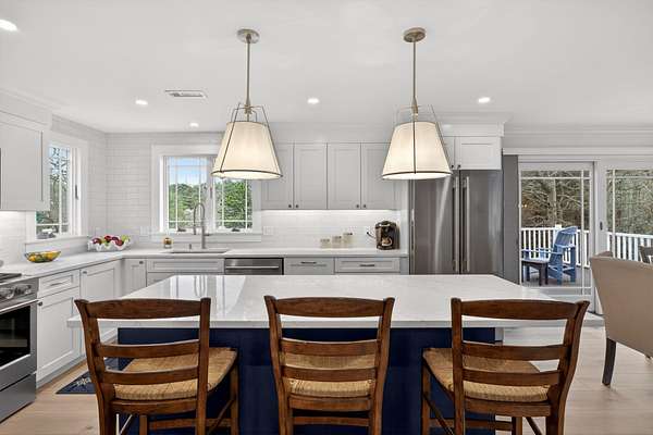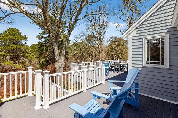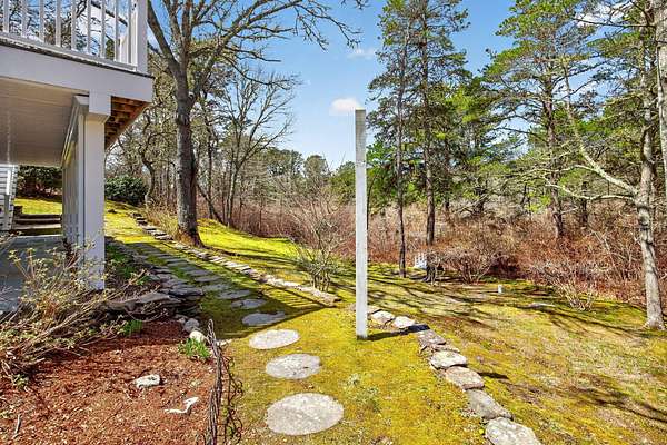 Sited in one of North Chatham's most coveted pockets, this is the kind of property that doesn't come up often - an oversized 1.67-acre lot, an elevated position with light on all sides, and finishes that reflect genuine attention to detail. Bluestone, granite, and natural materials settle the home quietly into its surroundings. The open-concept first floor delivers a brand-new kitchen with quartz countertops and center island, wide plank white oak floors, a fireplace hearth, and a slider to an oversized deck with views over the natural land beyond. The first-floor primary suite features a walk-in closet, a well-appointed bath, and its own private connection to the deck. Upstairs, an oversized loft affords flexibility for a range of uses. The walkout lower level - bright, full-height, and fully finished - includes a second bedroom, kitchenette, full bath, laundry, bluestone patio, and garage: an ideal guest suite. Deeded access to Lovers Lake and a private association beach complete the picture. Three levels of considered living, quality materials, and one of North Chatham's most compelling and rarely available addresses.