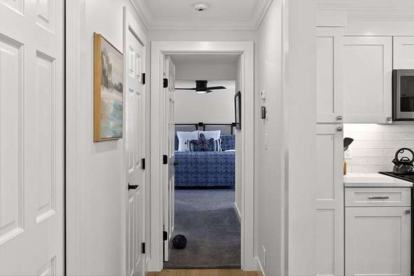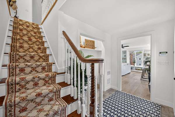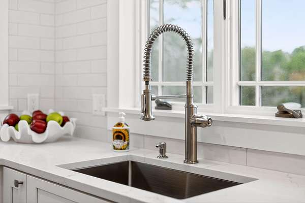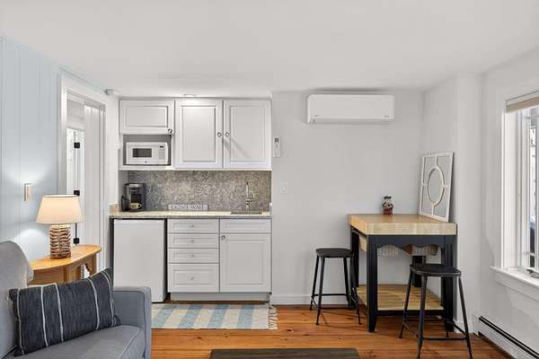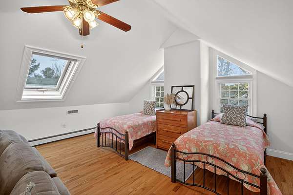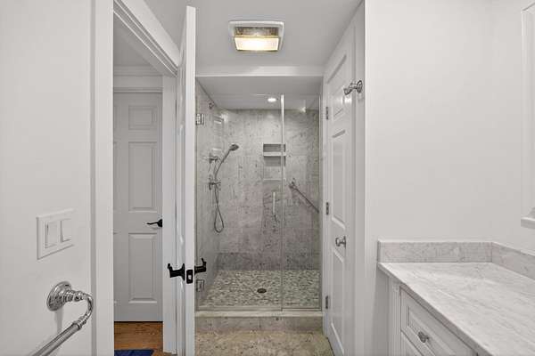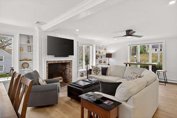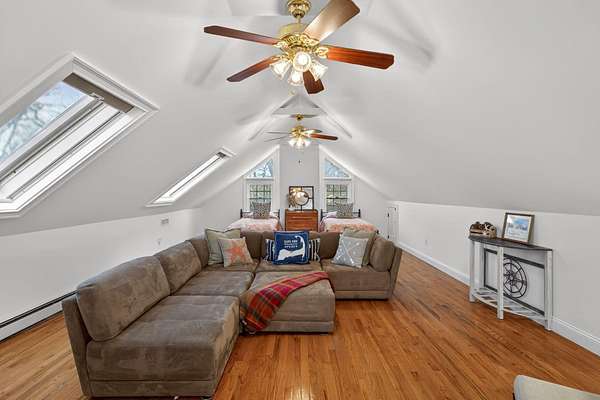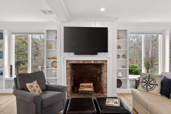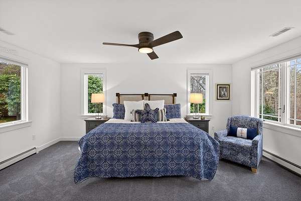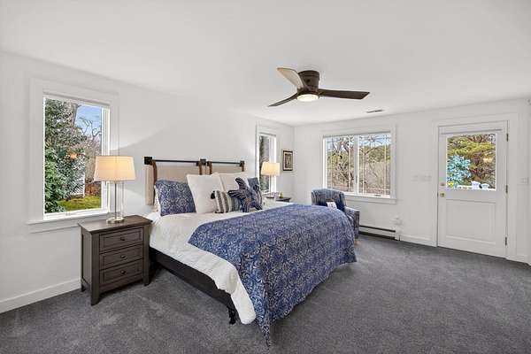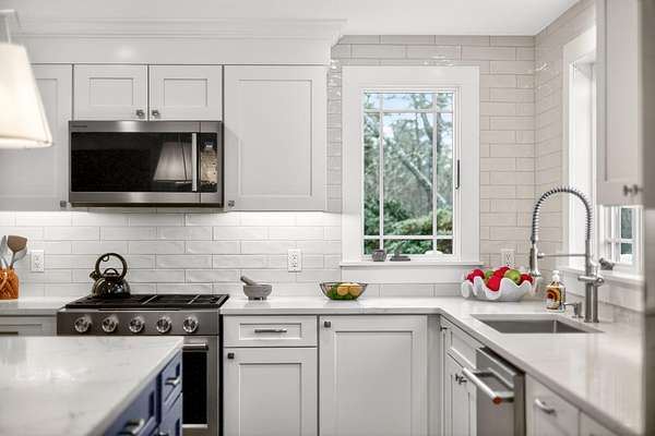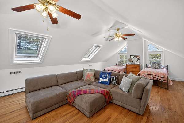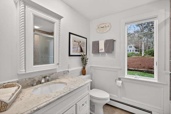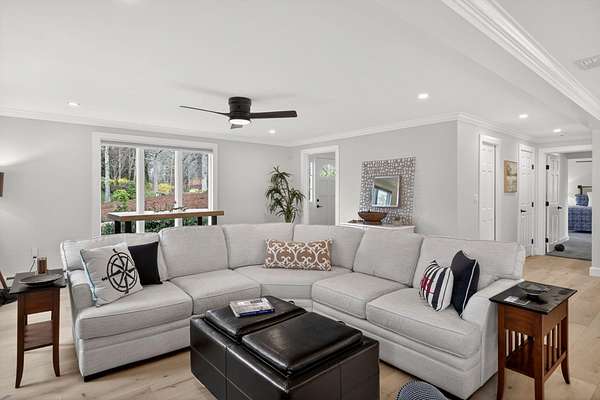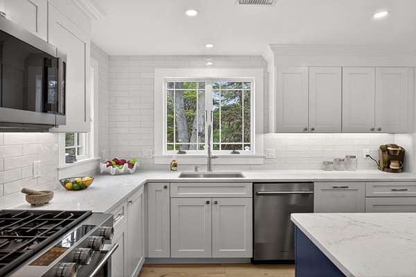 Sited in one of North Chatham's most coveted pockets, this is the kind of property that doesn't come up often - an oversized 1.67-acre lot, an elevated position with light on all sides, and finishes that reflect genuine attention to detail. Bluestone, granite, and natural materials settle the home quietly into its surroundings. The open-concept first floor delivers a brand-new kitchen with quartz countertops and center island, wide plank white oak floors, a fireplace hearth, and a slider to an oversized deck with views over the natural land beyond. The first-floor primary suite features a walk-in closet, a well-appointed bath, and its own private connection to the deck. Upstairs, an oversized loft affords flexibility for a range of uses. The walkout lower level - bright, full-height, and fully finished - includes a second bedroom, kitchenette, full bath, laundry, bluestone patio, and garage: an ideal guest suite. Deeded access to Lovers Lake and a private association beach complete the picture. Three levels of considered living, quality materials, and one of North Chatham's most compelling and rarely available addresses.